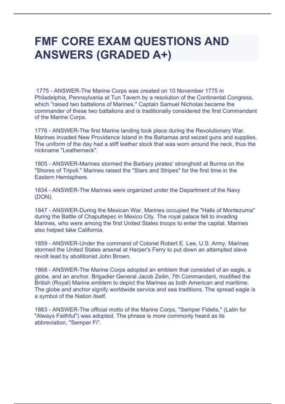 1775 - ANSWER-The Marine Corps was created on 10 November 1775 in Philadelphia, Pennsylvania at Tun Tavern by a resolution of the Continental Congress, which "raised two battalions of Marines." Captain Samuel Nicholas became the commander of these two battalions and is traditionally considered the first Commandant of the Marine Corps. 1776 - ANSWER-The first Marine landing took place during the Revolutionary War. Marines invaded New Providence Island in the Bahamas and seized guns and supplies. The uniform of the day had a stiff leather stock that was worn around the neck, thus the nickname "Leatherneck". 1805 - ANSWER-Marines stormed the Barbary pirates' stronghold at Burma on the "Shores of Tripoli." Marines raised the "Stars and Stripes" for the first time in the Eastern Hemisphere. 1834 - ANSWER-The Marines were organized under the Department of the Navy (DON). 1847 - ANSWER-During the Mexican War, Marines occupied the "Halls of Montezuma" during the Battle of Chapultepec in Mexico City. The royal palace fell to invading Marines, who were among the first United States troops to enter the capital. Marines also helped take California. 1859 - ANSWER-Under the command of Colonel Robert E. Lee, U.S. Army, Marines stormed the United States arsenal at Harper's Ferry to put down an attempted slave revolt lead by abolitionist John Brown. 1868 - ANSWER-The Marine Corps adopted an emblem that consisted of an eagle, a globe, and an anchor. Brigadier General Jacob Zeilin, 7th Commandant, modified the British (Royal) Marine emblem to depict the Marines as both American and maritime. The globe and anchor signify worldwide service and sea traditions. The spread eagle is a symbol of the Nation itself. 1883 - ANSWER-The official motto of the Marine Corps, "Semper Fidelis," (Latin for "Always Faithful") was adopted. The phrase is more commonly heard as its abbreviation, "Semper Fi". 1900 - ANSWER-In support of foreign policy, Marines from ships on the Asiatic station defended the American Legation in Peking, China during the Boxer Rebellion. The Marines were part of a multinational defense force that protected the Legation Quarter against attack. This small defense force held out against the Boxers until a relief force was able to reach Peking and end the rebellion. 1912 - ANSWER-The marine corps established its aviation unit. Marine major, Alfred A. Cunningham was the first pilot. His first solo flight (1stLt at the time) occurred on 1 Aug 1912