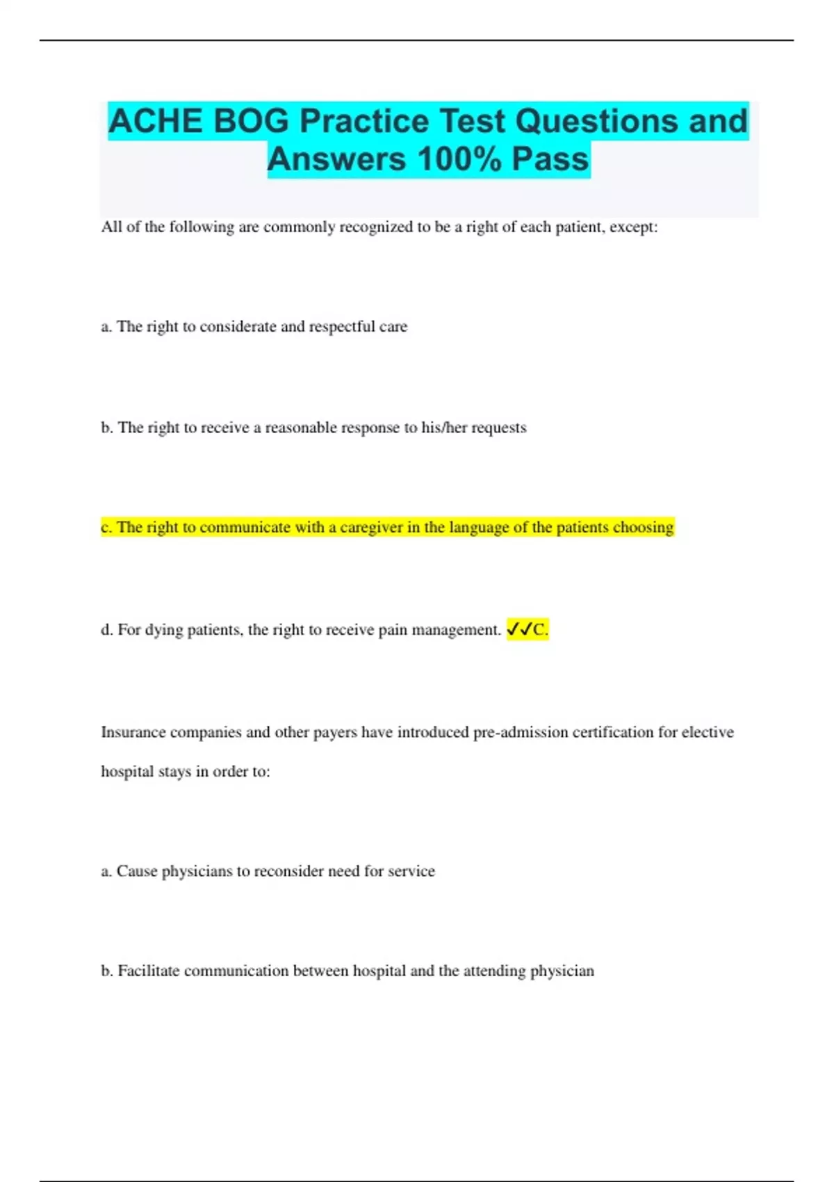 All of the following are commonly recognized to be a right of each patient, except: a. The right to considerate and respectful care b. The right to receive a reasonable response to his/her requests c. The right to communicate with a caregiver in the language of the patients choosing d. For dying patients, the right to receive pain management. C.