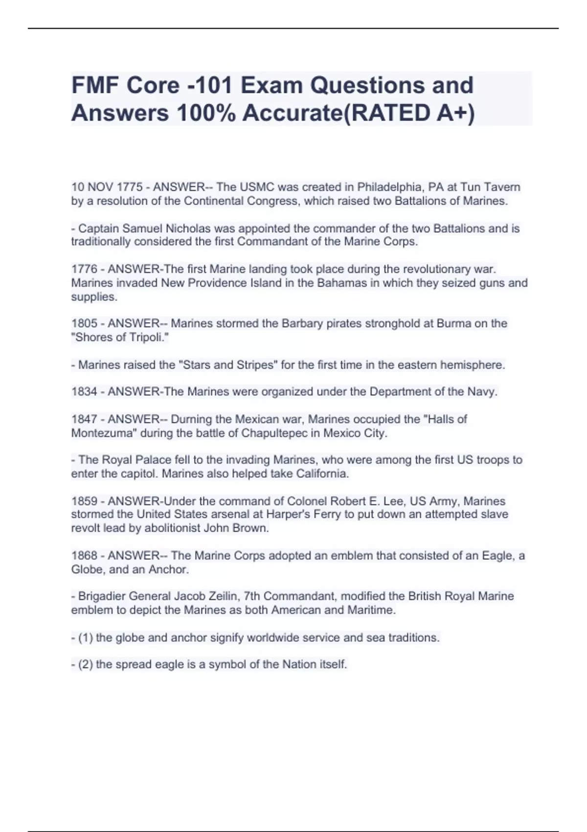 10 NOV 1775 - ANSWER-- The USMC was created in Philadelphia, PA at Tun Tavern by a resolution of the Continental Congress, which raised two Battalions of Marines. - Captain Samuel Nicholas was appointed the commander of the two Battalions and is traditionally considered the first Commandant of the Marine Corps. 1776 - ANSWER-The first Marine landing took place during the revolutionary war. Marines invaded New Providence Island in the Bahamas in which they seized guns and supplies. 1805 - ANSWER-- Marines stormed the Barbary pirates stronghold at Burma on the "Shores of Tripoli." - Marines raised the "Stars and Stripes" for the first time in the eastern hemisphere. 1834 - ANSWER-The Marines were organized under the Department of the Navy. 1847 - ANSWER-- Durning the Mexican war, Marines occupied the "Halls of Montezuma" during the battle of Chapultepec in Mexico City. - The Royal Palace fell to the invading Marines, who were among the first US troops to enter the capitol. Marines also helped take California. 1859 - ANSWER-Under the command of Colonel Robert E. Lee, US Army, Marines stormed the United States arsenal at Harper's Ferry to put down an attempted slave revolt lead by abolitionist John Brown. 1868 - ANSWER-- The Marine Corps adopted an emblem that consisted of an Eagle, a Globe, and an Anchor. - Brigadier General Jacob Zeilin, 7th Commandant, modified the British Royal Marine emblem to depict the Marines as both American and Maritime. - (1) the globe and anchor signify worldwide service and sea traditions. - (2) the spread eagle is a symbol of the Nation itself. 1883 - ANSWER-The official motto of the Marine Corps, "Semper Fidelis" (Latin for "Always Faithful") was adopted. The phrase is more commonly heard as its abbreviation, "Semper Fi". 1900 - ANSWER-- In support of foreign policy, Marines from ships on on the Asiatic station defended the American Legation(office that doesn't qualify as an embassy) in Peking, China during the Boxer Rebellion. - The Marines were part of the multinational defense force that protected the Legation Quarter against attack. 1912 - ANSWER-- The Marine Corps established its Aviation Unit. - Marine Major, Alfred A. Cunningham was the first pilot. His first solo flight (1stLt at the time) occurred on 1 AUG. 1917 - ANSWER-- Marines landed as part of the American Force in France. - Marines, participated in eight distinct operations, distinguishing themselves and were awarded a number of decorations, among them the French Fourragere; still worn by members of the 5th and 6th Marines.