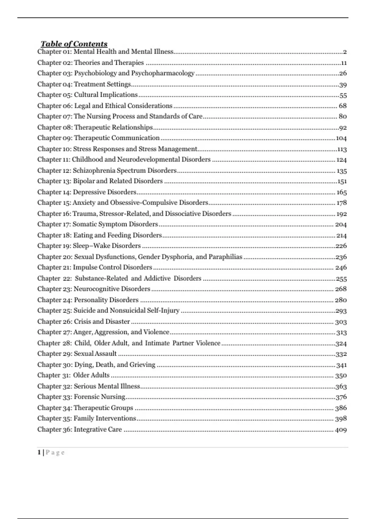 Test Bank Varcarolis' Foundations of Psychiatric-MentalHealth Nursing A Clinical 9th Edition by Margaret Jordan HalterTable of Contents Chapter 01: Mental Health and Mental Illness............................................................................................ 2 Chapter 02: Theories and Therapies ..........................................................................................................11 Chapter 03: Psychobiology and Psychopharmacology .............................................................................. 26 Chapter 04: Treatment Settings ................................................................................................................. 39 Chapter 05: Cultural Implications ............................................................................................................. 55 Chapter 06: Legal and Ethical Considerations ......................................................................................... 68 Chapter 07: The Nursing Process and Standards of Care ......................................................................... 80 Chapter 08: Therapeutic Relationships ..................................................................................................... 92 Chapter 09: Therapeutic Communication ............................................................................................... 104 Chapter 10: Stress Responses and Stress Management............................................................................113 Chapter 11: Childhood and Neurodevelopmental Disorders ................................................................... 124 Chapter 12: Schizophrenia Spectrum Disorders ...................................................................................... 135 Chapter 13: Bipolar and Related Disorders .............................................................................................. 151 Chapter 14: Depressive Disorders ............................................................................................................ 165 Chapter 15: Anxiety and Obsessive-Compulsive Disorders ..................................................................... 178 Chapter 16: Trauma, Stressor-Related, and Dissociative Disorders ........................................................ 192 Chapter 17: Somatic Symptom Disorders ............................................................................................... 204 Chapter 18: Eating and Feeding Disorders .............................................................................................. 214 Chapter 19: Sleep–Wake Disorders .........................................................................................................226 Chapter 20: Sexual Dysfunctions, Gender Dysphoria, and Paraphilias ..................................................236 Chapter 21: Impulse Control Disorders .................................................................................................. 246 Chapter 22: Substance-Related and Addictive Disorders ........................................................................ 255 Chapter 23: Neurocognitive Disorders ................................................................................................... 268 Chapter 24: Personality Disorders ......................................................................................................... 280 Chapter 25: Suicide and Nonsuicidal Self-Injury ....................................................................................293 Chapter 26: Crisis and Disaster .............................................................................................................. 303 Chapter 27: Anger, Aggression, and Violence .......................................................................................... 313 Chapter 28: Child, Older Adult, and Intimate Partner Violence ..............................................................324 Chapter 29: Sexual Assault ...................................................................................................................... 332 Chapter 30: Dying, Death, and Grieving ................................................................................................. 341 Chapter 31: Older Adults ......................................................................................................................... 350 Chapter 32: Serious Mental Illness .......................................................................................................... 363 Chapter 33: Forensic Nursing .................................................................................................................. 376 Chapter 34: Therapeutic Groups ............................................................................................................ 386 Chapter 35: Family Interventions ........................................................................................................... 398 Chapter 36: Integrative Care .................................................................................................................. 409 1 | P a g eChapter 01: Mental Health and Mental Illness MULTIPLE CHOICE 1. A staff nurse completes orientation to a psychiatric unit. This nurse may expect an advanced practice nurse to perform which additional intervention? a. Conduct mental health assessments. b. Prescribe psychotropic medication. c. Establish therapeutic relationships. d. Individualize nursing care plans. ANS: B In most states, prescriptive privileges are granted to master‘s-prepared nurse practitioners and clinical nurse specialists who have taken special courses on prescribing medication. The nurse prepared at the basic level is permitted to perform mental health assessments, establish relationships, and provide individualized care planning. PTS: 1 DIF: Cognitive Level: Understand (Comprehension) REF: Page 1-23 TOP: Nursing Process: Implementation MSC: Client Ne