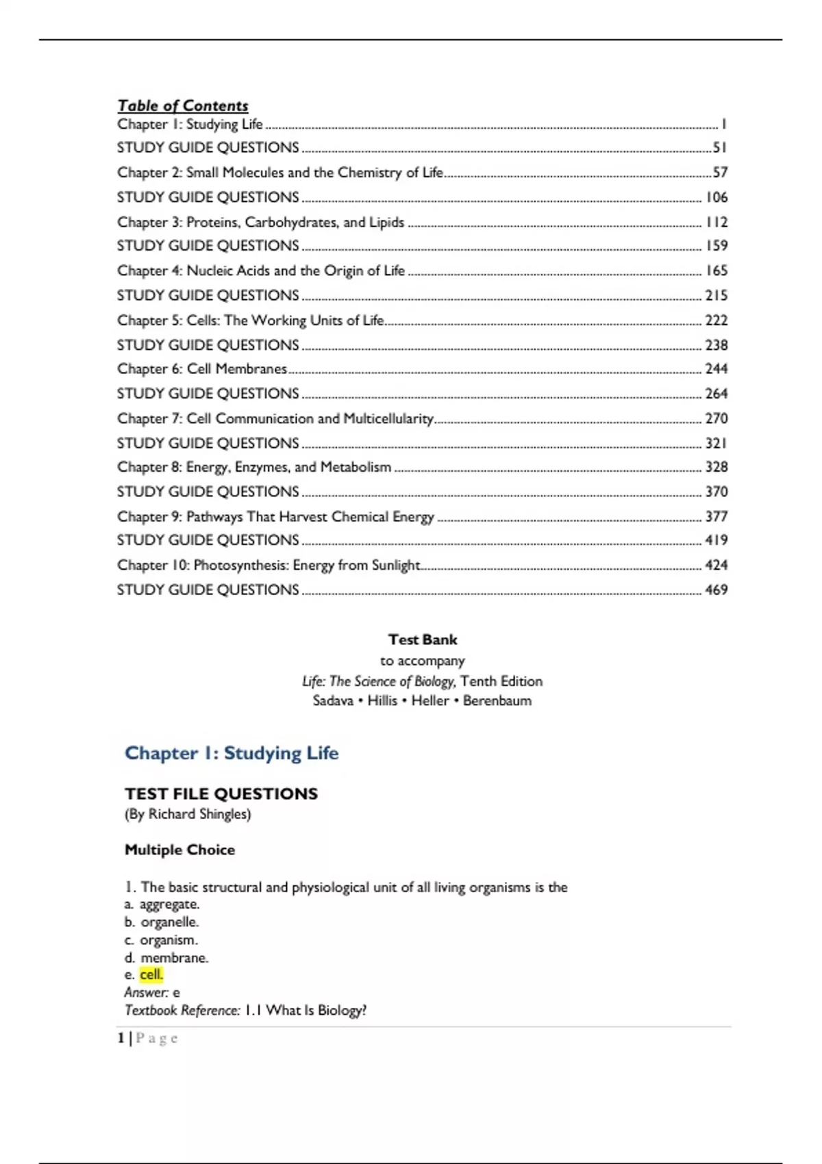 Test Bank to Accompany Life The Science of Biology, 10th Edition Sadava, Hillis, Heller, Berenbaumof Contents Chapter 1: Studying Life ......................................................................................................................................... 1 STUDY GUIDE QUESTIONS ............................................................................................................................ 51 Chapter 2: Small Molecules and the Chemistry of Life ................................................................................. 57 STUDY GUIDE QUESTIONS ......................................................................................................................... 106 Chapter 3: Proteins, Carbohydrates, and Lipids ......................................................................................... 112 STUDY GUIDE QUESTIONS ......................................................................................................................... 159 Chapter 4: Nucleic Acids and the Origin of Life ......................................................................................... 165 STUDY GUIDE QUESTIONS ......................................................................................................................... 215 Chapter 5: Cells: The Working Units of Life ................................................................................................ 222 STUDY GUIDE QUESTIONS ......................................................................................................................... 238 Chapter 6: Cell Membranes ............................................................................................................................. 244 STUDY GUIDE QUESTIONS ......................................................................................................................... 264 Chapter 7: Cell Communication and Multicellularity ................................................................................. 270 STUDY GUIDE QUESTIONS ......................................................................................................................... 321 Chapter 8: Energy, Enzymes, and Metabolism ............................................................................................. 328 STUDY GUIDE QUESTIONS ......................................................................................................................... 370 Chapter 9: Pathways That Harvest Chemical Energy ................................................................................ 377 STUDY GUIDE QUESTIONS ......................................................................................................................... 419 Chapter 10: Photosynthesis: Energy from Sunlight ..................................................................................... 424 STUDY GUIDE QUESTIONS ......................................................................................................................... 469 Test Bank to accompany Life: The Science of Biology, Tenth Edition Sadava • Hillis • Heller • Berenbaum Chapter 1: Studying Life TEST FILE QUESTIONS (By Richard Shingles) Multiple Choice 1. The basic structural and physiological unit of all living organisms is the a. aggregate. b. organelle. c. organism. d. membrane. e. cell. Answer: e Textbook Reference: 1.1 What Is Biology? 1 | P a g eBloom’s Category: 1. Remembering 2. A cell a. can be composed of many types of tissues. b. is found only in plants and animals. c. is the smallest entity studied by biologists. d. may be a distinct entity or a building block of a more complex organism. e. All of the above Answer: d Textbook Reference: 1.1 What Is Biology? Bloom’s Category: 2. Understanding 3. The Curiosity rover is currently searching for signs of life on Mars. What kind of evidence would most likely indicate the presence of living organisms on Mars? a. Fossilized prokaryotic cells b. Different nucleic acids and amino acids than those found on Earth c. Fatty acid molecules d. Complex molecules containing genetic information e. Simple organic molecules Answer: d Textbook Reference: 1.1 What Is Biology? Bloom’s Category: 5. Evaluating 4. Which of the following is not true of life? a. Life has a common ancestry. b. Life is made up of living organisms. c. Living organisms are all descended from a common origin. d. Life has multiple origins. e. Life has striking similarities across gene sequences. Answer: d Textbook Reference: 1.1 What Is Biology? Bloom’s Category: 2. Understanding 5. Earth is approximately years old. a. 5.5 million b. 40–50 million c. 4.5 billion d. 5 trillion e. 40 trillion Answer: c Textbook Reference: 1.1 What Is Biology? Bloom’s Category: 1. Remembering 6. There has been life on Earth for approximately a. 10 thousand b. 4 million c. 100 million d. 1 billion e. 4 billion Answer: e Textbook Reference: 1.1 What Is Biology? Bloom’s Category: 1. Remembering 2 | P a g e years.7. The oldest rocks on Earth are approximately years old. a. 4,000‒5,000 b. 400,000‒500,000 c. 2–3 million d. 4–5 billion e. 8 billion Answer: d Textbook Reference: 1.1 What Is Biology? Bloom’s Category: 2. Understanding 8. The seed of a desert plant may be dormant for many years without growing, but is still considered to be alive because it a. is always converting molecules. b. possesses heritable information. c. is always regulating its internal environment. d. is reproducing. e. is extracting energy from its environment. Answer: b Textbook Reference: 1.1 What Is Biology? Bloom’s Category: 2. Understanding 9. Which of the following statements about viruses is true? a. They do not mutate and evolve. b. They do not contain genetic information. c. They carry out physiological functions on their own. d. Their existence depends on cells. e. Biologists do not consider viruses to be part of life. Answer: d Textbook Reference: 1.1 What Is Biology? Bloom’s C