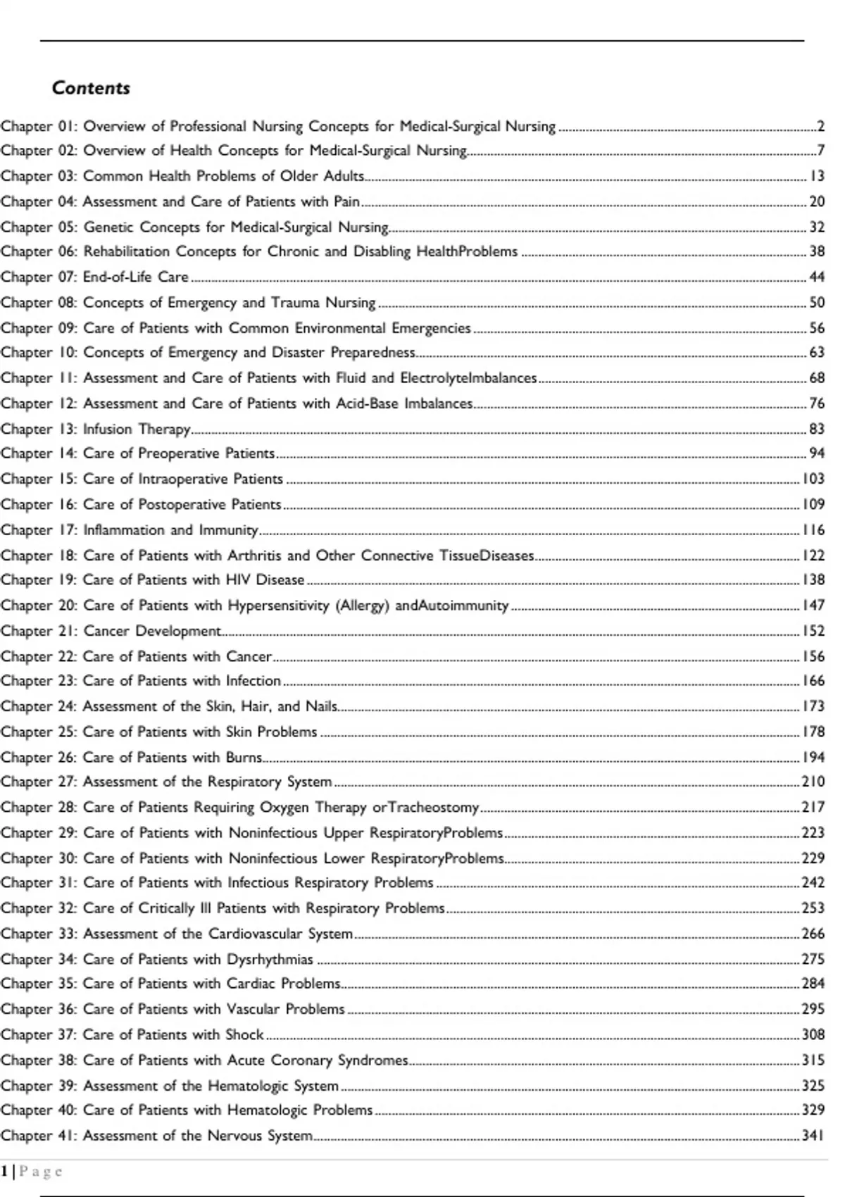 TEST BANK MEDICAL SURGICAL NURSING Concepts for Interprofessional 9TH EDITION Ignatavicius M. Linda Workman Cherie RebarContents Chapter 01: Overview of Professional Nursing Concepts for Medical- Surgical Nursing ............................................................................2 Chapter 02: Overview of Health Concepts for Medical-Surgical Nursing.......................................................................................................7 Chapter 03: Common Health Problems of Older Adults.................................................................................................................................. 13 Chapter 04: Assessment and Care of Patients with Pain ................................................................................................................................... 20 Chapter 05: Genetic Concepts for Medical-Surgical Nursing........................................................................................................................... 32 Chapter 06: Rehabilitation Concepts for Chronic and Disabling Health Problems .................................................................................... 38 Chapter 07: End-of-Life Care ..................................................................................................................................................................................... 44 Chapter 08: Concepts of Emergency and Trauma Nursing .............................................................................................................................. 50 Chapter 09: Care of Patients with Common Environmental Emergencies .................................................................................................. 56 Chapter 10: Concepts of Emergency and Disaster Preparedness................................................................................................................... 63 Chapter 11: Assessment and Care of Patients with Fluid and Electrolyte Imbalances ............................................................................... 68 Chapter 12: Assessment and Care of Patients with Acid-Base Imbalances .................................................................................................. 76 Chapter 13: Infusion Therapy ..................................................................................................................................................................................... 83 Chapter 14: Care of Preoperative Patients ............................................................................................................................................................ 94 Chapter 15: Care of Intraoperative Patients ....................................................................................................................................................... 103 Chapter 16: Care of Postoperative Patients ........................................................................................................................................................ 109 Chapter 17: Inflammation and Immunity ............................................................................................................................................................... 116 Chapter 18: Care of Patients with Arthritis and Other Connective Tissue Diseases .............................................................................. 122 Chapter 19: Care of Patients with HIV Disease ................................................................................................................................................. 138 Chapter 20: Care of Patients with Hypersensitivity (Allergy) and Autoimmunity ..................................................................................... 147 Chapter 21: Cancer Development .......................................................................................................................................................................... 152 Chapter 22: Care of Patients with Cancer ........................................................................................................................................................... 156 Chapter 23: Care of Patients with Infection ........................................................................................................................................................ 166 Chapter 24: Assessment of the Skin, Hair, and Nails........................................................................................................................................ 173 Chapter 25: Care of Patients with Skin Problems ............................................................................................................................................. 178 Chapter 26: Care of Patients with Burns.............................................................................................................................................................. 194 Chapter 27: Assessment of the Respiratory System ......................................................................................................................................... 210 Chapter 28: Care of Patients Requiring Oxygen Therapy or Tracheostomy .............................................................................................. 217 Chapter 29: Care of Patients with Noninfectious Upper Respiratory Problems ....................................................................................... 223 Chapter 30: Care of Patients with Noninfectious Lower Respiratory Problems....................................................................................... 229 Chapter 31: Care of Patients with Infectious Respiratory Problems ........................................................................................................... 242 Chapter 32: Care of Critically Ill Patients with Respiratory Problems .................................................