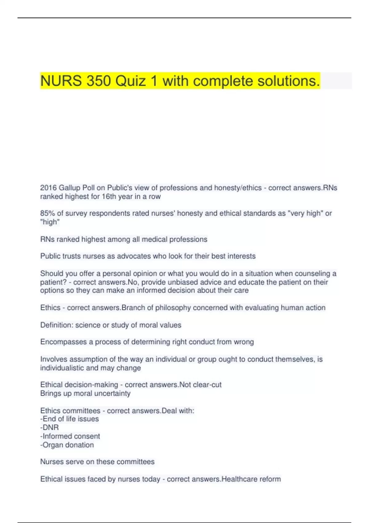 NURS 350 Quiz 1 with complete solutions. 2016 Gallup Poll on Public's view of professions and honesty/ethics - correct answers.RNs ranked highest for 16th year in a row 85% of survey respondents rated nurses' honesty and ethical standards as "very high" or "high" RNs ranked highest among all medical professions Public trusts nurses as advocates who look for their best interests Should you offer a personal opinion or what you would do in a situation when counseling a patient? - correct answers.No, provide unbiased advice and educate the patient on their options so they can make an informed decision about their care Ethics - correct answers.Branch of philosophy concerned with evaluating human action Definition: science or study of moral values Encompasses a process of determining right conduct from wrong Involves assumption of the way an individual or group ought to conduct themselves, is individualistic and may change Ethical decision-making - correct answers.Not clear-cut Brings up moral uncertainty Ethics committees - correct answers.Deal with: -End of life issues -DNR -Informed consent -Organ donation Nurses serve on these committees Ethical issues faced by nurses today - correct answers.Healthcare reform Uninsured Poor Nursing shortage End of life issues Strikes Rationing of care Drug and alcohol impairment Greatest challenge in ethics - correct answers.Your choice may not be popular Listen to your "inner compass" Decisions not always linear Can a bad choice be repaired? THINK before you respond You ALWAYS have a choice! Autonomy - correct answers.Right of self-determination Choice, independence, and freedom from controlling influences Respect for the individual, each person is unique and equal to others Dignity, inherent worth, self-reliance, individualism and power, personal liberty Beneficence - correct answers.Obligation to do good, not harm Prevent evil or harm Act in best interest of the client Nonmaleficence - correct answers.Prohibition of intentional harm -ex. family member abuse, drug/alcohol-impaired co-worker Pt should be no worse for having been nursed Justice - correct answers.Fairness Obligation to treat like cases similarly Being equitable No favoritism Equitable distribution of resources Fidelity - correct answers.Obligation to be faithful to agreements, commitments, and responsibilities Faithfulness and loyalty to client Foundation of accountability Accepting responsibility for your actions Veracity - correct answers.Truth-telling Not intentionally deceiving or misleading Involves trust and respect Ethical theories - correct answers.Utilitarianism Deontology Theory of social justice Utilitarianism - correct answers.Also known as: -Consequentialism