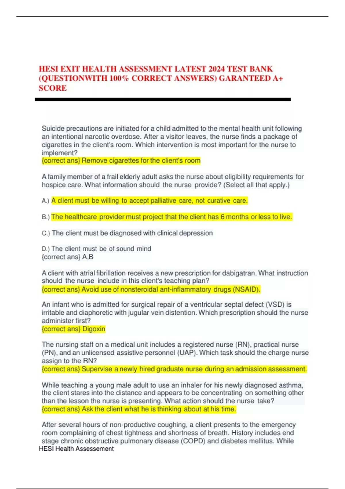HESI EXIT HEALTH ASSESSMENT LATEST 2024 TEST BANK (QUESTIONWITH 100% CORRECT ANSWERS) GARANTEED A+ SCORE