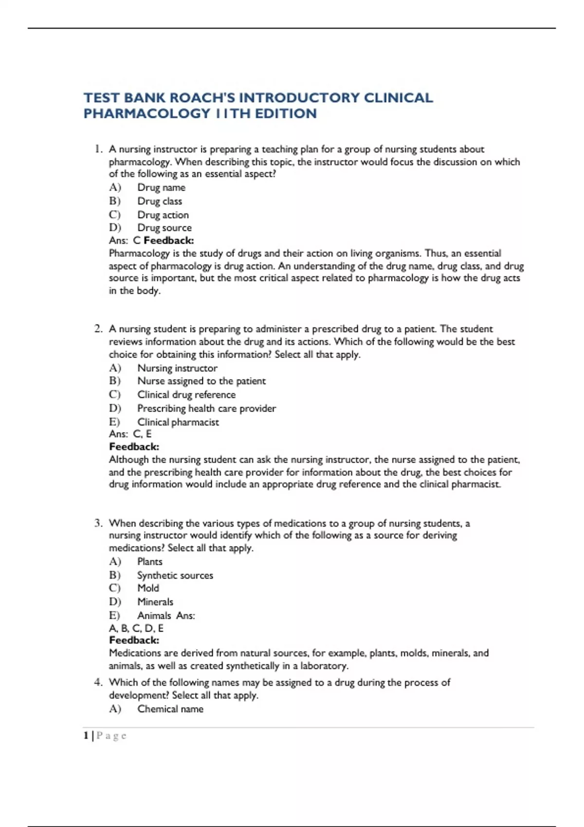 TEST BANK ROACH'S INTRODUCTORY CLINICAL PHARMACOLOGY 11TH EDITION1. A nursing instructor is preparing a teaching plan for a group of nursing students about pharmacology. When describing this topic, the instructor would focus the discussion on which of the following as an essential aspect? A) Drug name B) Drug class C) Drug action D) Drug source Ans: C Feedback: Pharmacology is the study of drugs and their action on living organisms. Thus, an essential aspect of pharmacology is drug action. An understanding of the drug name, drug class, and drug source is important, but the most critical aspect related to pharmacology is how the drug acts in the body. 2. A nursing student is preparing to administer a prescribed drug to a patient. The student reviews information about the drug and its actions. Which of the following would be the best choice for obtaining this information? Select all that apply. A) Nursing instructor B) Nurse assigned to the patient C) Clinical drug reference D) Prescribing health care provider E) Clinical pharmacist Ans: C, E Feedback: Although the nursing student can ask the nursing instructor, the nurse assigned to the patient, and the prescribing health care provider for information about the drug, the best choices for drug information would include an appropriate drug reference and the clinical pharmacist. 3. When describing the various types of medications to a group of nursing students, a nursing instructor would identify which of the following as a source for deriving medications? Select all that apply. A) Plants B) Synthetic sources C) Mold D) Minerals E) Animals Ans: A, B, C, D, E Feedback: Medications are derived from natural sources, for example, plants, molds, minerals, and animals, as well as created synthetically in a laboratory. 4. Which of the following names may be assigned to a drug during the process of development? Select all that apply. A) Chemical name 1 | P a g eB) Official name C) Pharmacologic name D) Trade name E) Nonproprietary name Ans: A, B, D, E Feedback: Throughout the process of development, drugs may have several names assigned to them including a chemical name, a generic (nonproprietary) name, an official name, and a trade or brand name. 5. A drug may be classified by which of the following? Select all that apply. A) The chemical type of the drug's active ingredient B) The way the drug is used to treat a specific condition C) The generic name of the drug D) The trade name of the drug E) The nonproprietary name of the drug Ans: A, B Feedback: A drug may be classified by the chemical type of the active ingredient or by the way it is used to treat a particular condition. Generic, trade, and nonproprietary refer to how a drug is named. 6. A group of nursing students are reviewing information about the process of drug development in the United States. The students demonstrate understanding of this process when they identify that which of the following categories are assigned by the Food and Drug Administration to newly approved drugs? Select all that apply. A) Metabolite B) Noncontrolled substance C) Prescription D) Nonprescription E) Controlled substance Ans: C, D, E Feedback: Once drugs are approved for use, the FDA assigns the drug to one of the following categories: prescription, nonprescription, or controlled substance. Metabolite refers to the inactive form of the drug. Noncontrolled substance is a term that is not used. 7. Which of the following would be most important for the nurse to do to ensure the safe use of prescription drugs in the institutional setting? Select all that apply. A) Administering drugs B) Monitoring clients for drug effects C) Prescribing drugs D) Evaluating clients for toxic effects E) Educating clients/caregivers about drugs Ans: A, B, D, E Feedback: In the institutional setting, the nurse's role to ensure safe use of prescription drugs includes administering drugs, monitoring drug effects, evaluating for toxic effects, and educating clients 2 | P a g eand caregivers about drugs. 8. The nurse is helping a client review a prescription from the health care provider. When examining the prescription, which of the following would the nurse expect to find documented? Select all that apply. A) Name of the drug B) Dosage of the drug C) Route of drug administration D) Times of drug administration E) Licensed prescriber's signature Ans: A, B, C, D, E Feedback: The prescription must contain the client's name, the name of the drug, the dosage, the method and times of administration, and the signature of the licensed health care provider prescribing the drug. 9. After teaching a group of nursing students about nonprescription drugs, the nursing instructor determines that the teaching was successful when the students identify which of the following? Select all that apply. A) They require a licensed health care provider's signature. B) They are referred to as over-the-counter drugs. C) They can be taken without risk to the client. D) They have certain labeling requirements. E) They should be taken only as directed on the label. Ans: B, D, E Feedback: Nonprescription drugs are often referred to as over-the-counter (OTC) drugs. They do not require a prescription (a licensed health care provider's signature) but do not come without risk to the client. The federal government has imposed labeling requirements of OTC drugs and they should only be taken as directed on the label unless under the supervision of a health care provider. 10. A nursing student is reviewing information about the Controlled Substances Act of 1970. The student would expect to find which of the following as being regulated for drugs classified as controlled substances? Select all that apply. A) Manufacturing B) Elimination C) Distribution D) Formulation E) Dispensing Ans: A, C, E Feedback: The Controlled Substances Act of 1970 regulates the manufacture, distribution, and dispensing of drugs classified as controlled substances. Elimination refers to the excretion