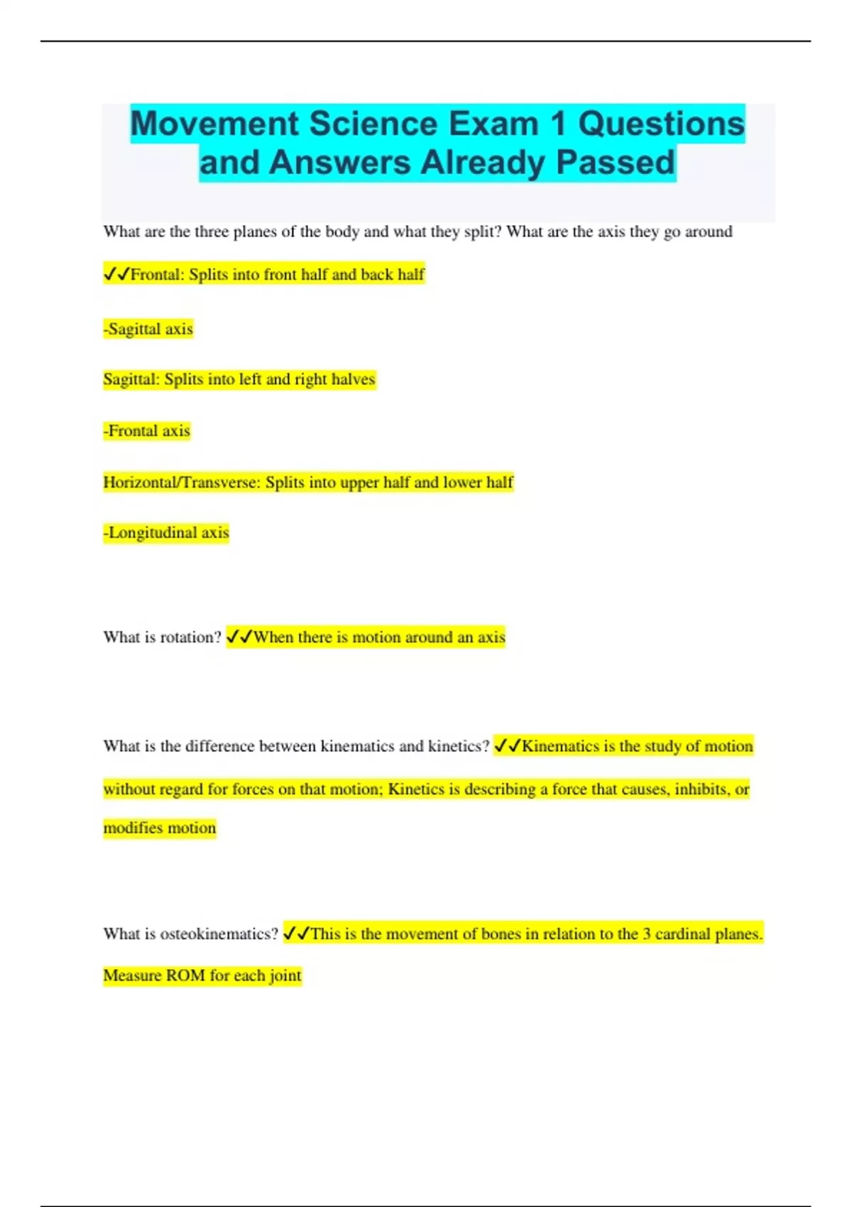 Movement Science Exam 1 Questions and Answers Already Passed What are the three planes of the body and what they split? What are the axis they go around Frontal: Splits into front half and back half -Sagittal axis Sagittal: Splits into left and right halves -Frontal axis Horizontal/Transverse: Splits into upper half and lower half -Longitudinal axis What is rotation? When there is motion around an axis What is the difference between kinematics and kinetics? Kinematics is the study of motion without regard for forces on that motion; Kinetics is describing a force that causes, inhibits, or modifies motion What is osteokinematics? This is the movement of bones in relation to the 3 cardinal planes. Measure ROM for each joint What is translatory motion? This is linear displacement; the moving of a segment in a straight line What is rotatory motion? This is angular displacement; when the movement arm is around a fixed axis on a circular path. Each point will go through the same angle, at the same time What is magnitude? What is rate? Magnitude is how much, can be measured with a goniometer or a ruler; Rate is how fast., can be speed/velocity/acceleration What are degrees of freedom? This is how much motion is available at a certain joint. How many planes a joint can go through (up to 3) What are accessory movements? Movements within the joint itself which allows for some passive translation. Called "joint play" While there are only 3 degrees of freedom for joints, sometimes there are references to 6. What are they? Up/Down, Forward/Back, Left/Right, Roll (angular up from left to right), Yaw (angular forward from left to right), and Pitch (angular down from forward to back) What are the two types of kinetic chain and how they move? -Open kinetic chain is when the distal segment is not fixed and is free to move, 1 joint moving doesn't affect another -Closed kinetic chain is when the distal segment is fixed and the proximal segment is free to move, automatically creates movement in other joints of the chain What is important to know about kinetic chains when it comes to clinical application? Whenever there is a change in the function or structure of one joint, it usually will cause a further change in the joint adjacent to the affected area. For example, when there is limited ROM at the knee, the hip and ankle joints have to compensate What are the six types of joints? -Gliding -Hinge -Pivot -Condyloid (Ellipsoid) -Saddle -Ball&Socket What is arthrokinematics? The motion that occurs between articular surfaces and is required for normal osteokinematics What is the fundamental movement roll in relation to arthrokinematics? This is when multiple points of one of one rotating surface contact multiple points of another Example: tire rotating along pavement What is the fundamental movement glide in relation to arthrokinematics? This is when a single point contacts multiple points of another surface Example: non-rotating tire skidding on icy pavement What is the fundamental movement spin in relation to arthrokinematics? A single point of one surface rotates onto a single point on another surface Example: radius on capitulum during pronation/supination Why are the three fundamental movements of arthrokinematics so important? They help to increase ROM in a joint and is especially important when joint surface areas are extremely different