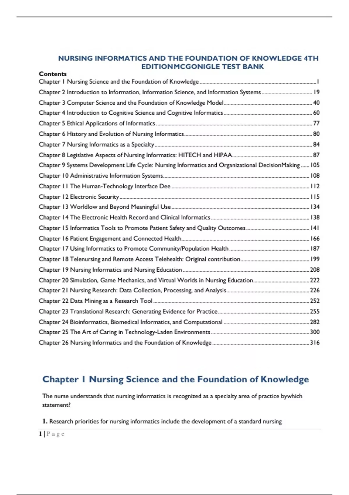 TEST BANK NURSING INFORMATICS AND THE FOUNDATION OF KNOWLEDGE 4TH EDITION MCGONIGLEContents Chapter 1 Nursing Science and the Foundation of Knowledge ...................................................................................1 Chapter 2 Introduction to Information, Information Science, and Information Systems .................................... 19 Chapter 3 Computer Science and the Foundation of Knowledge Model ............................................................... 40 Chapter 4 Introduction to Cognitive Science and Cognitive Informatics ............................................................... 60 Chapter 5 Ethical Applications of Informatics ............................................................................................................... 77 Chapter 6 History and Evolution of Nursing Informatics ........................................................................................... 80 Chapter 7 Nursing Informatics as a Specialty ................................................................................................................ 84 Chapter 8 Legislative Aspects of Nursing Informatics: HITECH and HIPAA ......................................................... 87 Chapter 9 Systems Development Life Cycle: Nursing Informatics and Organizational Decision Making ...... 105 Chapter 10 Administrative Information Systems ........................................................................................................ 108 Chapter 11 The Human-Technology Interface Dee .................................................................................................. 112 Chapter 12 Electronic Security ....................................................................................................................................... 115 Chapter 13 Worldlow and Beyond Meaningful Use .................................................................................................. 134 Chapter 14 The Electronic Health Record and Clinical Informatics ...................................................................... 138 Chapter 15 Informatics Tools to Promote Patient Safety and Quality Outcomes ............................................. 141 Chapter 16 Patient Engagement and Connected Health ........................................................................................... 166 Chapter 17 Using Informatics to Promote Community/Population Health ......................................................... 187 Chapter 18 Telenursing and Remote Access Telehealth: Original contribution ................................................. 199 Chapter 19 Nursing Informatics and Nursing Education .......................................................................................... 208 Chapter 20 Simulation, Game Mechanics, and Virtual Worlds in Nursing Education ........................................ 222 Chapter 21 Nursing Research: Data Collection, Processing, and Analysis ........................................................... 226 Chapter 22 Data Mining as a Research Tool ............................................................................................................... 252 Chapter 23 Translational Research: Generating Evidence for Practice ................................................................. 255 Chapter 24 Bioinformatics, Biomedical Informatics, and Computational ............................................................. 282 Chapter 25 The Art of Caring in Technology-Laden Environments ...................................................................... 300 Chapter 26 Nursing Informatics and the Foundation of Knowledge ..................................................................... 316 Chapter 1 Nursing Science and the Foundation of Knowledge The nurse understands that nursing informatics is recognized as a specialty area of practice by which statement? 1. Research priorities for nursing informatics include the development of a standard nursing 1 | P a g elanguage and the development of databases for clinical information. 2. A formal educational program at the master's level must be completed before a nurse is eligible to sit for the credentialing examination. 3. As a differentiated practice, nursing informatics is focused upon the client, the environment, health, and the nurse. 4. There is a need for nursing informatics interests to gain representation by work groups and organizations within the United States. Correct Answer: 1 Rationale 1: The development of research priorities is a key point in a specialty practice. Although degrees at the master's level are available, the degree required for credentialing is typically at the bachelor's level and includes experience in the field. Current demands for safer, cost-effective, quality care require evidence of the best practices supported by research. Rationale 2: Such a formal educational program does not necessarily mean a specialty area of practice. Although degrees at the master's level are available, the degree required for credentialing is typically at the bachelor's level and includes experience in the field. The development of research priorities is a key point in a specialty practice. Rationale 3: Your chosen response refers to the entire discipline of nursing. The specialty of nursing informatics integrates nursing science, computer science, and information science to manage and communicate data, information, knowledge, and wisdom into nursing practice. The development of research priorities is a key point in a specialty practice. Rationale 4: There are many work groups in the United States related to informatics that focus on the specialty of informatics practice. One example is the Nursing Informatics Special Interest Group of the International Medical Informatics Association. The development of research priorities is a key point in a specialty practice. Global Rationale: Cognitive Level: Understanding Client Need: Safe Effective Care 