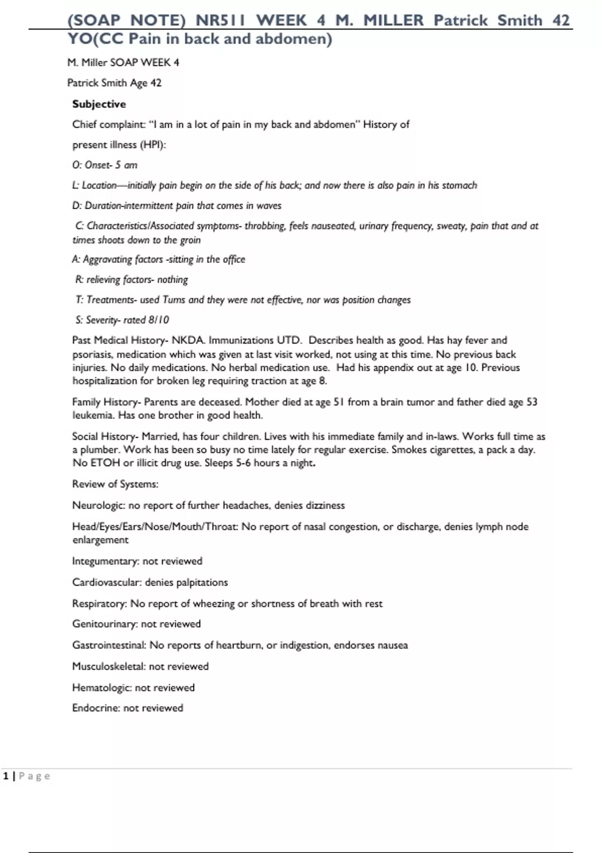 (SOAP NOTE) NR511 WEEK 4 M. MILLER Patrick Smith 42 YO(CC Pain in back and abdomen)