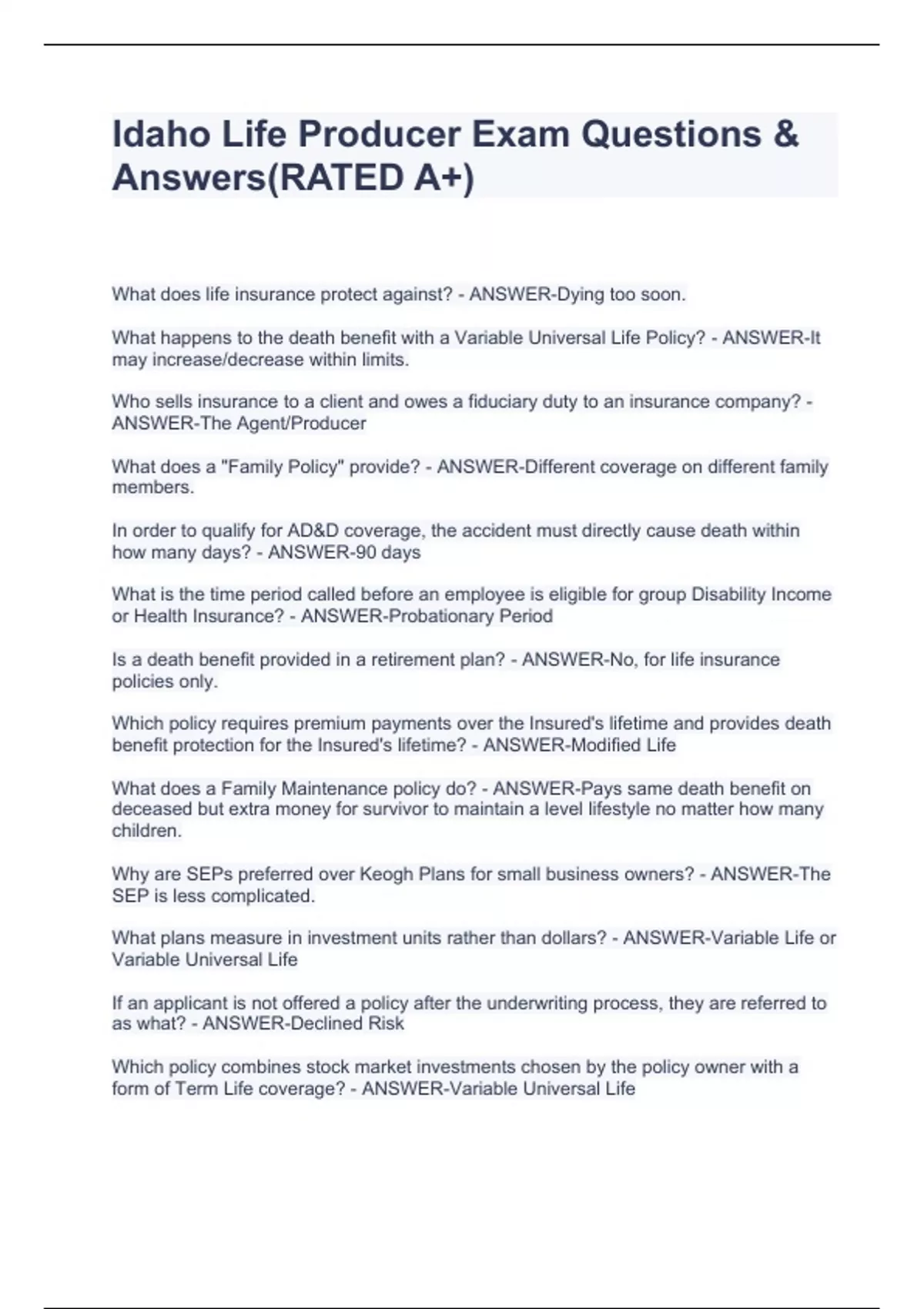 Idaho Life Producer Exam Questions & Answers(RATED A+)