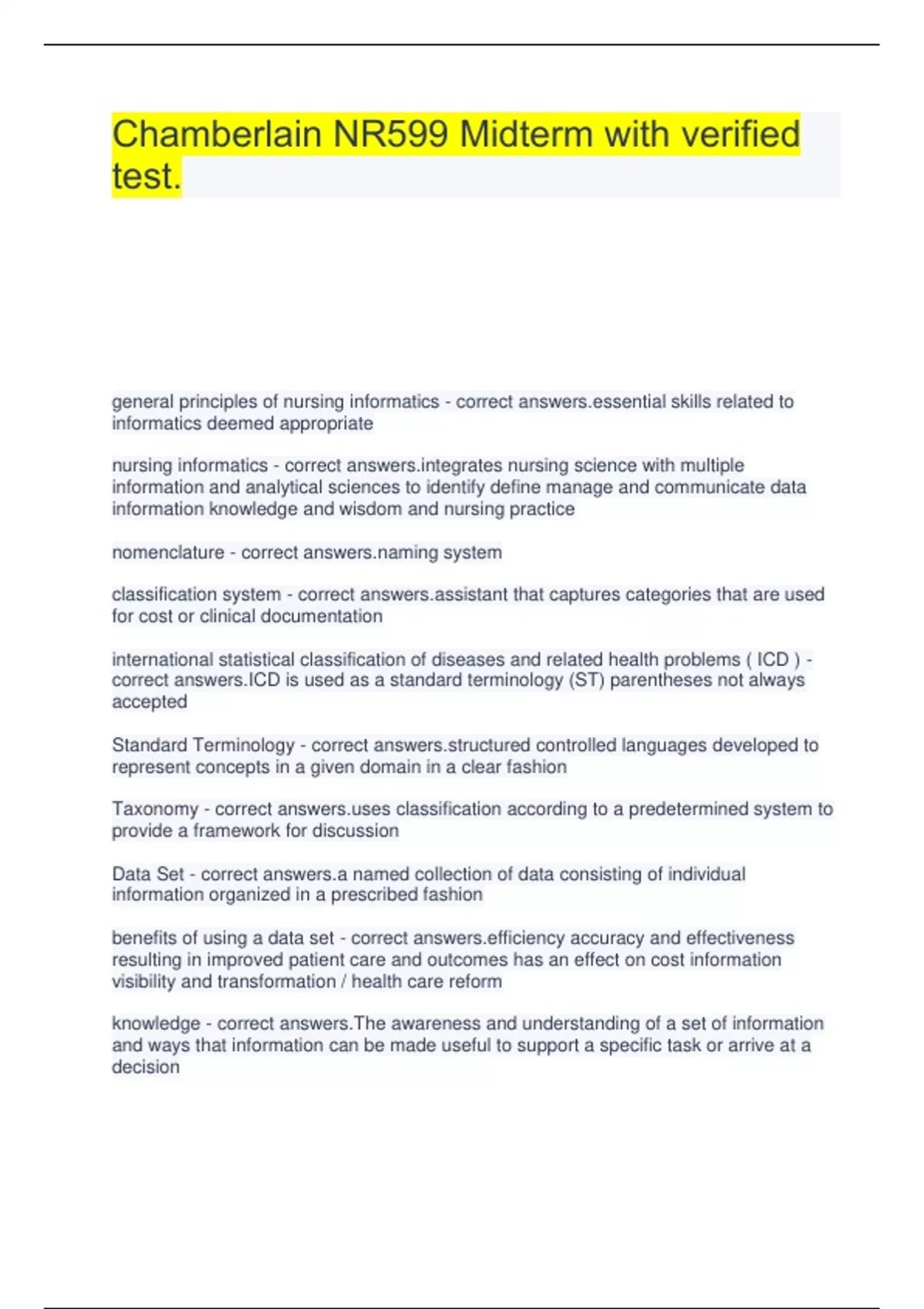 Chamberlain NR599 Midterm with verified test. general principles of nursing informatics - correct tial skills related to informatics deemed appropriate nursing informatics - correct rates nursing science with multiple information and analytical sciences to identify define manage and communicate data information knowledge and wisdom and nursing practice nomenclature - correct g system classification system - correct tant that captures categories that are used for cost or clinical documentation international statistical classification of diseases and related health problems ( ICD ) - correct answers.ICD is used as a standard terminology (ST) parentheses not always accepted Standard Terminology - correct tured controlled languages developed to represent concepts in a given domain in a clear fashion Taxonomy - correct classification according to a predetermined system to provide a framework for discussion Data Set - correct answers.a named collection of data consisting of individual information organized in a prescribed fashion benefits of using a data set - correct iency accuracy and effectiveness resulting in improved patient care and outcomes has an effect on cost information visibility and transformation / health care reform knowledge - correct answers.The awareness and understanding of a set of information and ways that information can be made useful to support a specific task or arrive at a decision