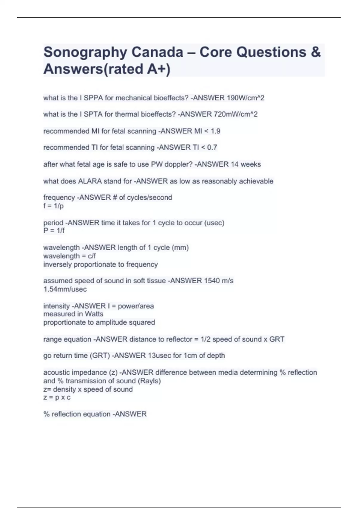 Sonography Canada – Core Qwhat is the I SPPA for mechanical bioeffects? -ANSWER 190W/cm^2 what is the I SPTA for thermal bioeffects? -ANSWER 720mW/cm^2 recommended MI for fetal scanning -ANSWER MI 1.9 recommended TI for fetal scanning -ANSWER TI 0.7 after what fetal age is safe to use PW doppler? -ANSWER 14 weeks what does ALARA stand for -ANSWER as low as reasonably achievable frequency -ANSWER # of cycles/second f = 1/p period -ANSWER time it takes for 1 cycle to occur (usec) P = 1/f wavelength -ANSWER length of 1 cycle (mm) wavelength = c/f inversely proportionate to frequency assumed speed of sound in soft tissue -ANSWER 1540 m/s uestions & Answers(rated A+)