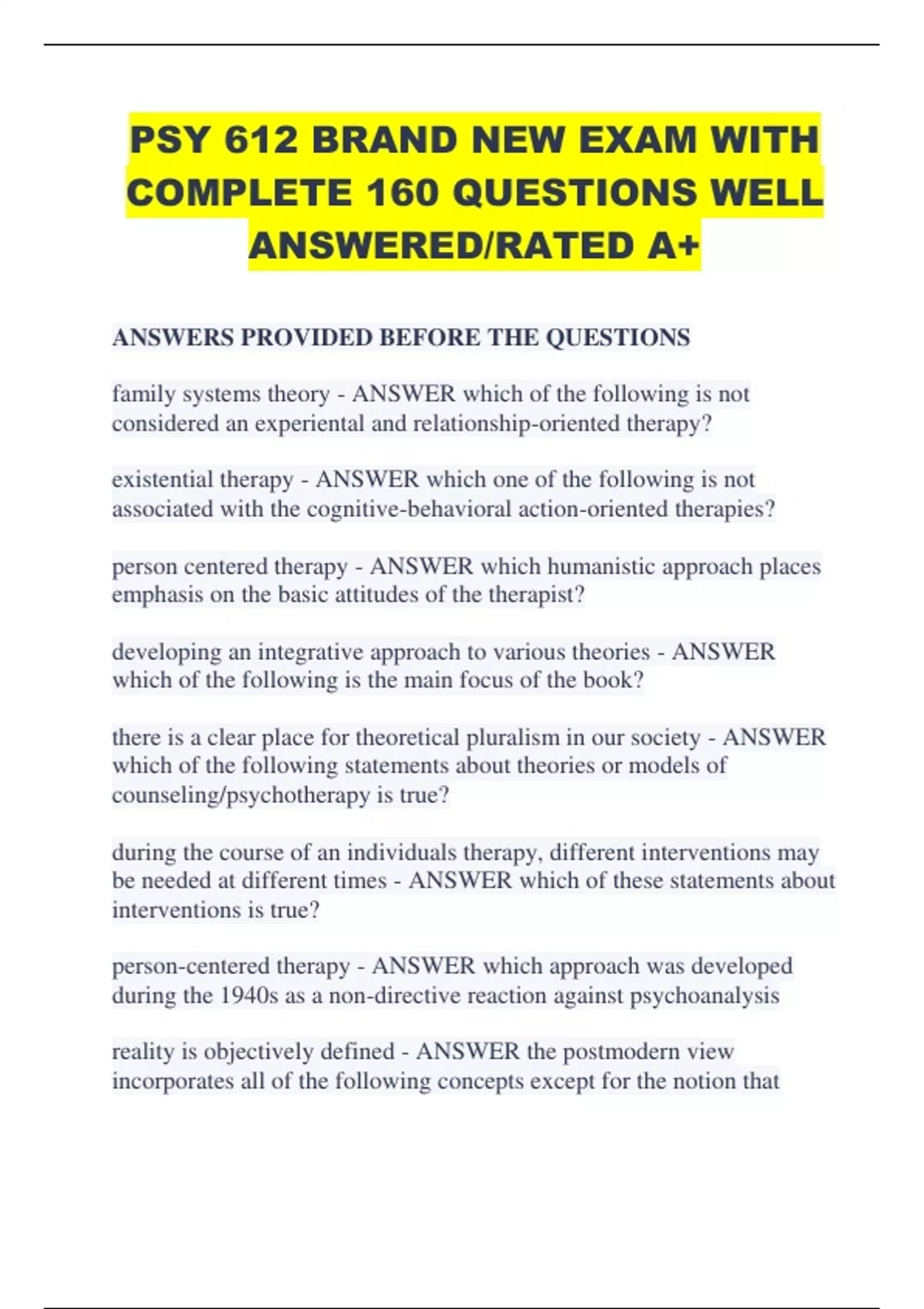PSY 612 BRAND NEW EXAM WITH COMPLETE 160 QUESTIONS WELL ANSWERED/RATED A+