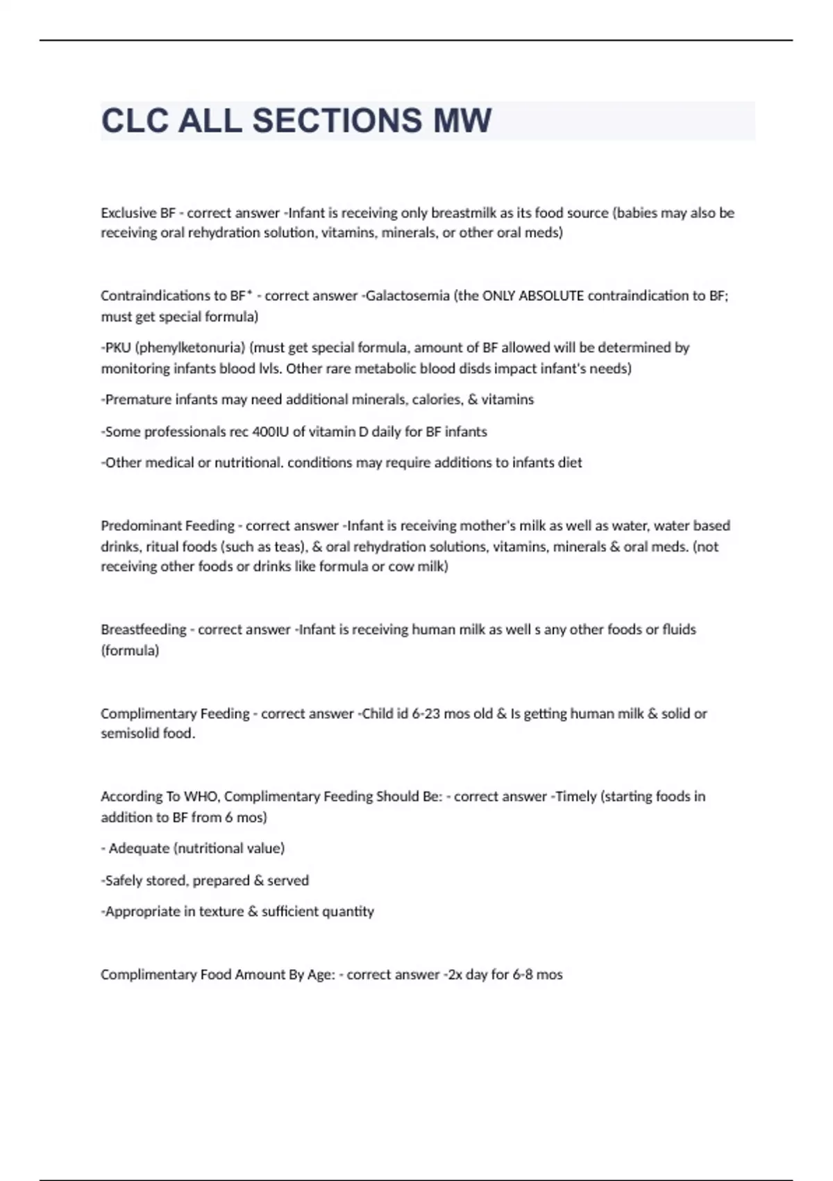CLC ALL SECTIONS MW Question and answers rated A+ 2023/2024Exclusive BF - correct answer -Infant is receiving only breastmilk as its food source (babies may also be receiving oral rehydration solution, vitamins, minerals, or other oral meds) Contraindications to BF* - correct answer -Galactosemia (the ONLY ABSOLUTE contraindication to BF; must get special formula) -PKU (phenylketonuria) (must get special formula, amount of BF allowed will be determined by monitoring infants blood lvls. Other rare metabolic blood disds impact infant's needs) -Premature infants may need additional minerals, calories, & vitamins -Some professionals rec 400IU of vitamin D daily for BF infants -Other medical or nutritional. conditions may require additions to infants diet