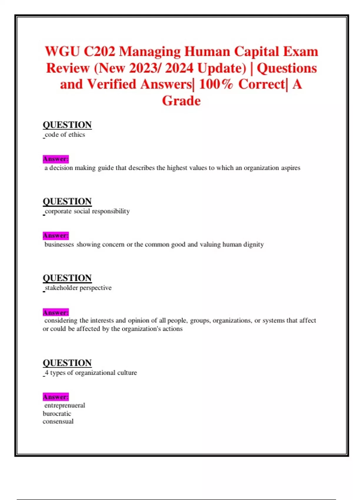 WGU C202 Managing Human Capital Exam Review (New 2023/ 2024 Update) | Questions and Verified Answers| 100% Correct| A Grade