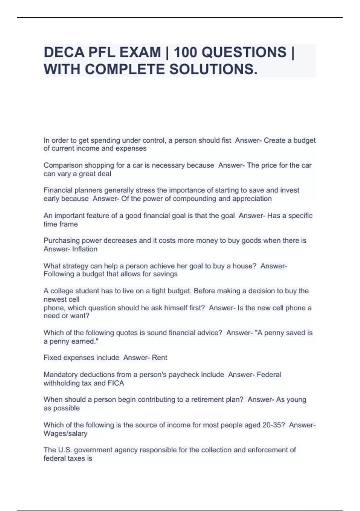 deca pfl exam 100 questions with complete solu