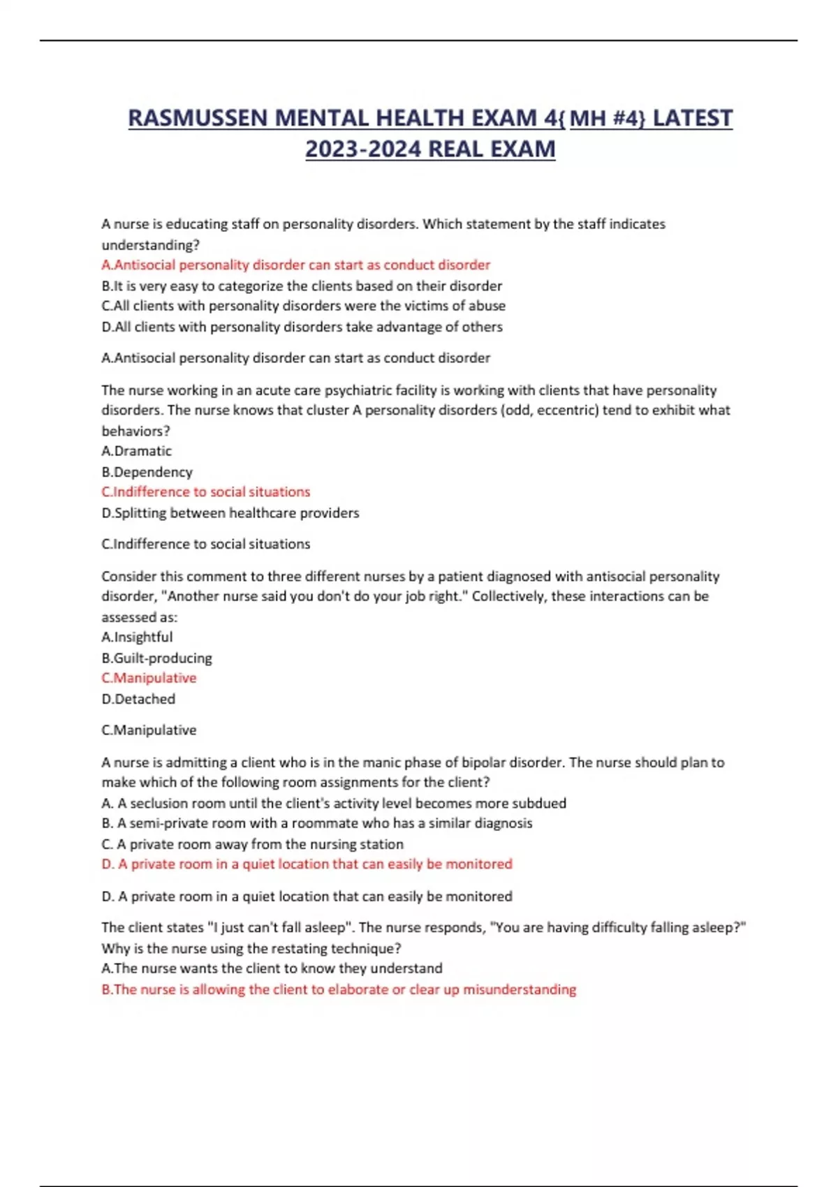 RASMUSSEN MENTAL HEALTH EXAM 4{ MH #4} LATEST REAL EXAM A nurse is educating staff on personality disorders. Which statement by the staff indicates understanding? A.Antisocial personality disorder can start as conduct disorder B.It is very easy to categorize the clients based on their disorder C.All clients with personality disorders were the victims of abuse D.All clients with personality disorders take advantage of others A.Antisocial personality disorder can start as conduct disorder The nurse working in an acute care psychiatric facility is working with clients that have personality disorders. The nurse knows that cluster A personality disorders (odd, eccentric) tend to exhibit what behaviors? A.Dramatic B.Dependency C.Indifference to social situations D.Splitting between healthcare providers C.Indifference to social situations Consider this comment to three different nurses by a patient diagnosed with antisocial personality disorder, "Another nurse said you don't do your job right." Collectively, these interactions can be assessed as: A.Insightful B.Guilt-producing C.Manipulative D.Detached C.Manipulative A nurse is admitting a client who is in the manic phase of bipolar disorder. The nurse should plan to make which of the following room assignments for the client? A. A seclusion room until the client's activity level becomes more subdued B. A semi-private room with a roommate who has a similar diagnosis C. A private room away from the nursing station D. A private room in a quiet location that can easily be monitored D. A private room in a quiet location that can easily be monitored The client states "I just can't fall asleep". The nurse responds, "You are having difficulty falling asleep?" Why is the nurse using the restating technique? A.The nurse wants the client to know they understand B.The nurse is allowing the client to elaborate or clear up misunderstanding conversation going D.The nurse wants to focus on one idea B.The nurse is allowing the client to elaborate or clear up misunderstanding A client is experiencing command hallucinations and appears to be frightened. Which of the following actions are appropriate nursing interventions? A.Keep the client physically safe B.Ignore the client's feelings in response to altered perceptions C.Assure the client that they are not experiencing something real D.Inform the client that their hallucinations are just bad dreams A.Keep the client physically safe A nurse is performing an admission assessment for an adolescent client with a diagnosis of schizophrenia. Which of the following findings should the nurse identify as a positive symptom? A.Somatic Delusions B.Anhedonia C.Waxy Posture (immobile posturing) D.Anergia A.Somatic Delusions A 28-year-old client with body dysmorphic disorder (BDD) tells the nurse that they plan to have a surgical procedure that will affect their appearance. The nurse understands that this plan is an effort to A.Suppress intrusive thoughts B.Deal with multiple physical complaints C.Treat associated depression D.Cure the imagined defect D.Cure the imagined defect An unlicensed assistive personnel (UAP) is working with clients that have diagnosis of obsessive compulsive disorder. The UAP understands the reason not to stop the carrying out of compulsions is: A.If this is not done therapeutically the client will have an escalation in anxiety B.The RNs don't trust the UAPs C.Stopping compulsions is not part of the treatment plan D.The obsessions are the client's problems not the compulsions A.If this is not done therapeutically the client will have an escalation in anxiety A client is pacing the hall near the nurse's station, swearing loudly. An appropriate initial intervention for the nurse would be to address the client by name and say: A."Please quiet down." B."You seem upset. Would you like to tell me about it?" C."Hey, why are you so upset?"D."You need to go to your room to get control of yourself." B."You seem upset. Would you like to tell me about it?" A nurse is reviewing the medical histories of four clients. Which of the following clients will be most likely to develop extrapyramidal symptoms from medication therapy? A.A client with depression taking selective serotonin reuptake inhibitors B.A client with schizoaffective disorder taking an atypical antipsychotic C.A client with schizophrenia taking a first-generation antipsychotic D.A client with anxiety disorder taking an anxiolytic medication C.A client with schizophrenia taking a first-generation antipsychotic A client with anorexia nervosa is at increased risk for which of the following? A.Osteopenia B.Increased testosterone C.Hyperglycemia D.Hypertension A.Osteopenia A nurse in the emergency department is i