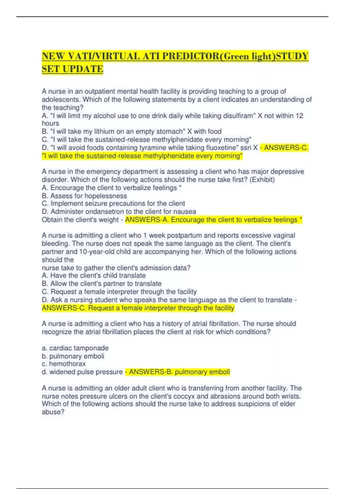 NEW VATI/VIRTUAL ATI PREDICTOR(Green light)STUDY SET UPDATE A nurse in an outpatient mental health facility is providing teaching to a group of adolescents. Which of the following statements by a client indicates an understanding of the teaching? A. "I will limit my alcohol use to one drink daily while taking disulfiram" X not within 12 hours B. "I will take my lithium on an empty stomach" X with food C. "I will take the sustained-release methylphenidate every morning" D. "I will avoid foods containing tyramine while taking fluoxetine" ssri X - ANSWERS-C. "I will take the sustained-release methylphenidate every morning" A nurse in the emergency department is assessing a client who has major depressive disorder. Which of the following actions should the nurse take first? (Exhibit) A. Encourage the client to verbalize feelings * B. Assess for hopelessness C. Implement seizure precautions for the client D. Administer ondansetron to the client for nausea Obtain the client's weight - ANSWERS-A. Encourage the client to verbalize feelings * A nurse is admitting a client who 1 week postpartum and reports excessive vaginal bleeding. The nurse does not speak the same language as the client. The client's partner and 10-year-old child are accompanying her. Which of the following actions should the nurse take to gather the client's admission data? A. Have the client's child translate B. Allow the client's partner to translate C. Request a female interpreter through the facility D. Ask a nursing student who speaks the same language as the client to translate - ANSWERS-C. Request a female interpreter through the facility A nurse is admitting a client who has a history of atrial fibrillation. The nurse should recognize the atrial fibrillation places the client at risk for which conditions? a. cardiac tamponade b. pulmonary emboli c. hemothorax d. widened pulse pressure - ANSWERS-B. pulmonary emboli A nurse is admitting an older adult client who is transferring from another facility. The nurse notes pressure ulcers on the client's coccyx and abrasions around both wrists. Which of the following actions should the nurse take to address suspicions of elder abuse? A. Contact the family regarding the client's condition B. Notify risk management C. Privately interview the client about her condition D. Inform the transferring agency of the client's condition - ANSWERS-C. Privately interview the client about her condition A nurse is an acute care facility is caring for four clients. Which of the following clients should the nurse refer for speech therapy? a. A client who has dysphagia following a stroke b. A client who has sensorineural hearing loss c. An older adult client who has stage III Alzheimer's disease d. A client who is postoperative following a tonsillectomy and adenoidectomy - ANSWERS-a. A client who has dysphagia following a stroke A nurse is an emergency department is reviewing the medical record for a client who is having an acute myocardial infarction. Which of the following findings places the client at risk if he receives alteplase? a. hip arthroplasty 1 week ago b. family history of malignant hypertension c. Chronic obstructive pulmonary disease d. Acute renal failure 6 months - ANSWERS-a. hip arthroplasty 1 week ago A nurse is assessing a client following abdominal surgery. Which of the following findings should the nurse report to the provider? A. Temperature 37.6 C (99.7 F) B. Urinary output 20 mL/hr C. Blood pressure 100/70 mm Hg D. Serious drainage on abdominal dressing - ANSWERS-B. Urinary output 20 mL/hr A nurse is assessing a client in the emergency department. Which of the following actions should the nurse take first? (exhibit) a. Place the client on a cooling blanket B. Obtain arterial blood gas levels C. Elevate the head of the client's bed to 30 D. Administer an analgesic - ANSWERS-B. Obtain arterial blood gas levels A nurse is assessing a client who has a chest tube with a water seal drainage system. Upon assessment, the nurse notes tidaling in the water seal. Which of the following is an explanation for the tidaling? TIDLING IN WATER SEAL AND CONTINUOUS IN SUCTION CHAMBER OKAY! WATER SEAL BUBBLING IS AIR LEAK. A. There is a loop of tubing below the drainage system B. The system is working properly C. The lung has re-expanded D. The tubing is partially obstructed by clots - ANSWERS-B. The system is working properly A nurse is assessing a client who has acute angle-closure glaucoma. Which of the following findings should the nurse expect? A. Increased light perception B. Reddened cornea C. Severe periocular pain D. Gray cast sclera - ANSWERS-C. Severe periocular pain A nurse is assessing a client who has fine hair, exophthalmos, ad reports intolerance to heat. Which of the following endocrine disorders is associated with these findings? a. Hyperparathyroidism b. Hyperthyroidism c. Hypoparathyroidism d. Hypothyroidism - ANSWERS-b. Hyperthyroidism A nurse is assessing a client who is experiencing a pulmonary embolism. Which following manifestations should the nurse expect? a. Hypertension b. Frothy sputum c. Bradycardia d. Dyspnea - ANSWERS-d. Dyspnea A nurse is assessing a client who is in active labor. Which of the following findings should the nurse report to the provider? a. Contractions lasting 80 seconds- too long? b. Depending on frequency* c. FHR baseline 170/min normal 110-160 maybe this! * Early decelerations in the FHR d. Temperature 37.4 C (99.3 F) - ANSWERS-c. FHR baseline 170/min normal 110-160 maybe this! * Early decelerations in the FHR A nurse is assessing a client who presents to the labor and delivery unit reporting the onset of contractions. Which of the following findings should the nurse identify as a manifestation of false labor? A. Presence of a bloody show B. Intermittent, painless contractions C. Slow change in dilation and effacement D. Contraction intensity increased by ambulation - ANSWERS-B. Intermittent, painless contractions