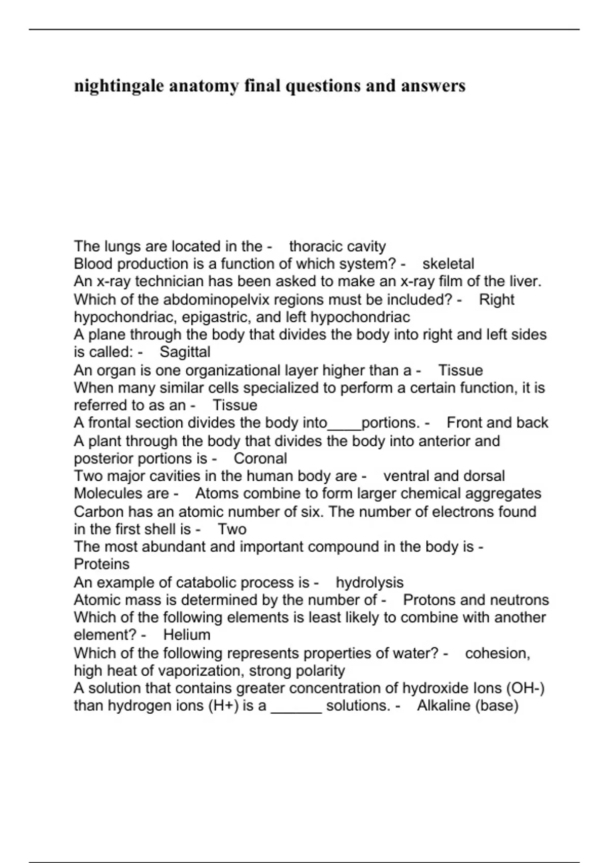 The lungs are located in the - thoracic cavity Blood production is a function of which system? - skeletal An x-ray technician has been asked to make an x-ray film of the liver. Which of the abdominopelvix regions must be included? - Right hypochondriac, epigastric, and left hypochondriac A plane through the body that divides the body into right and left sides is called: - Sagittal An organ is one organizational layer higher than a - Tissue When many similar cells specialized to perform a certain function, it is referred to as an - Tissue A frontal section divides the body into____portions. - Front and back A plant through the body that divides the body into anterior and posterior portions is - Coronal Two major cavities in the human body are - ventral and dorsal Molecules are - Atoms combine to form larger chemical aggregates Carbon has an atomic number of six. The number of electrons found in the first shell is - Two The most abundant and important compound in the body is - Proteins An example of catabolic process is - hydrolysis Atomic mass is determined by the number of - Protons and neutrons Which of the following elements is least likely to combine with another element? - Helium Which of the following represents properties of water? - cohesion, high heat of vaporization, strong polarity A solution that contains greater concentration of hydroxide Ions (OH-) than hydrogen ions (H+) is a ______ solutions. - Alkaline (base) Which of the following is not one of the major elements present in the human body? - Zinc Acids: - proton donors, taste sour, release hydrogen ions in aqueous solutions A specialized cell structure that propels the sperm is the: - flagellum Which of the following describes a structure or function of the proteasome? - Breaking down abnormal and midfielder proteins released from the ER Looks like a hollow cylindrical drum made of protein subunits Requires the small protein called ubiquitin to pull proteins in The fundamental organizational unit of life is the - Cell A list of the cell fibers from largest to smallest would read: - microtubules, intermediate filaments, microfilaments Which organelle processes and packages material to be secreted? - Golgi apparatus The nucleoli is composed chiefly of - rRNA The inner membrane of what double-membrane structure is contorted into folds called cristae? - mitochondrion The structure of cells that is associated with the enzymatic breakdown (digestion) of foreign material is the: - lysosome Which of the following is not a function of the smooth ER? - Provides a site of ribosome attachment Which cell fiber serves as part of the cell muscles? - Microfilament The mixed secretions of sebaceous and ceremonious glands form a brown waxy substance called the: - Cerumen Around the sixth month of pregnancy, the developing fetus is almost entirely covered by a fine soft hair coat called the: - lanugo A lubricating substance produced by goblet cells is called - mucus The ____ junction "glues" the epidermis and dermis together together and provides mechanical support for the epidermis. - Dermoepidermal Besides water, extracellular matrix contains: - Proteins and proteoglycan Of the many different kinds of protein compounds in the body, which is the most abundant? - Collagen