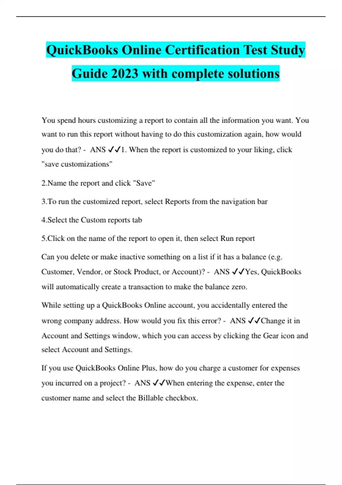 QuickBooks Online Certification Test Study Guide 2023 with complete solutions You spend hours customizing a report to contain all the information you want. You want to run this report without having to do this customization again, how would you do that? - ANS ️️ 1. When the report is customized to your liking, click "save customizations" 2.Name the report and click "Save" 3.To run the customized report, select Reports from the navigation bar 4.Select the Custom reports tab 5.Click on the name of the report to open it, then select Run report Can you delete or make inactive something on a list if it has a balance (e.g. Customer, Vendor, or Stock Product, or Account)? - ANS ️️ Yes, QuickBooks will automatically create a transaction to make the balance zero. While setting up a QuickBooks Online account, you accidentally entered the wrong company address. How would you fix this error? - ANS ️️ Change it in Account and Settings window, which you can access by clicking the Gear icon and select Account and Settings. If you use QuickBooks Online Plus, how do you charge a customer for expenses you incurred on a project? - ANS ️️ When entering the expense, enter the customer name and select the Billable checkbox