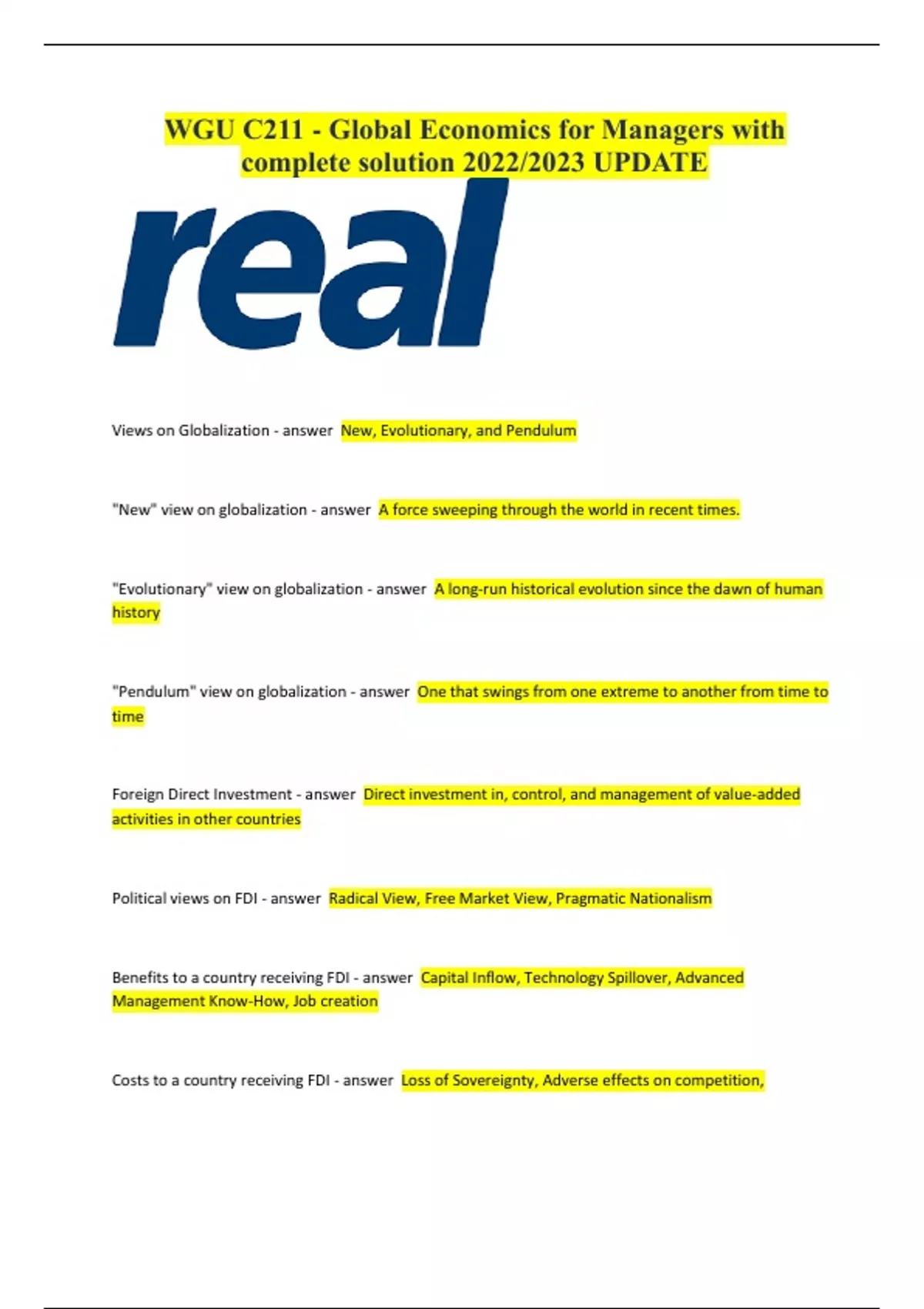 WGU C211 - Global Economics for Managers with complete solution 2022/2023 UPDATE Views on Globalization - answer New, Evolutionary, and Pendulum "New" view on globalization - answer A force sweeping through the world in recent times. "Evolutionary" view on globalization - answer A long-run historical evolution since the dawn of human history "Pendulum" view on globalization - answer One that swings from one extreme to another from time to time Foreign Direct Investment - answer Direct investment in, control, and management of value-added activities in other countries Political views on FDI - answer Radical View, Free Market View, Pragmatic Nationalism Benefits to a country receiving FDI - answer Capital Inflow, Technology Spillover, Advanced Management Know-How, Job creation Costs to a country receiving FDI - answer Loss of Sovereignty, Adverse effects on competition, Capital outflow. How do resources and capabilities influence the competitive dynamics of a business? - answer Resource similarity and market commonality can yield a powerful framework for competitor analysis. Resource similarity - answer The extent to which a given competitor possesses strategic endowment comparable, in terms of both type and amount, to those of the focal firm. How does resource similarity impact competitive dynamics? - answer Firms with a high degree are likely to have similar competitive actions. (Starbuck's instant coffee & McDonald's iced coffee) Classical theories of international trade - answer Mercantilism, Absolute advantage, and Comparative advantage Modern theory view - answer Dynamic Classical theory view - answer Static Absolute advantage - answer The economic advantage one nation enjoys that is superior to other nations Comparative advantage - answer The advantage one economic activity nation enjoys in comparison with other nations (relative, not absolute) Mercantilism - answer A theory that suggests that the wealth of the world is fixed and that a nation that exports more and imports less will be richer. Features of the product life cycle? - answer New, Maturing, and Standardized Strategic trade - answer Intervention by governments in certain industries can enhance their odds for international success. How are supply and demand related to the exchange rate of a country? - answer The price of a commodity, a country's currency, is fundamentally determined by this. Strong demand leads to price hikes; oversupply results in price drops. Which theory came first? - answer Mercantilism (although both are of the idea that governments should actively protect domestic industries from imports and vigorously promote exports) If a company seeks to limit foreign exchange rate exposure in the forward direction, what is the most effective way to do this? - answer Forward transactions, an act know as currency hedging. Transaction risk - answer The exchange rate risk associated with the time delay between entering into a contract and settling it. Hedging - answer A transaction, such as forward transactions, that protects traders and investors from exposure to the fluctuations of the spot rate. Currency hedging - answer A way to protect traders and investors from being exposed to the fluctuations of the spot rate Strategic hedging - answer A means of spreading out activities in different currency zones in order to offset the currency losses in certain regions through gains in other regions (currency diversification) First mover advantages - answer Proprietary, technological leadership, pre-emption of scarce resources, establishment of entry barriers to late entrants, avoidance of clash with dominant firms at home, relationships with key stakeholders, (such as governments.) Late mover advantages - answer Opportunity to free ride on first-mover investments, Resolution of technological and market uncertainty, First mover's difficulty to adapt to market changes.) Foreign market entries types - answer Non-equity and equity Non-equity - answer Reflects relatively smaller commitments to overseas markets. Determines firms MNE status. Equity - answer indicative of relatively larger, harder-to-reverse commitments. Determines firms MNE status. How do institutions reduce uncertainty? - answer Establish "rules of the game" that economic players play by. A standard to follow in order to survive and prosper. By signaling which conduct is legitimate and which is not, institutions constrain the range of acceptable actions.