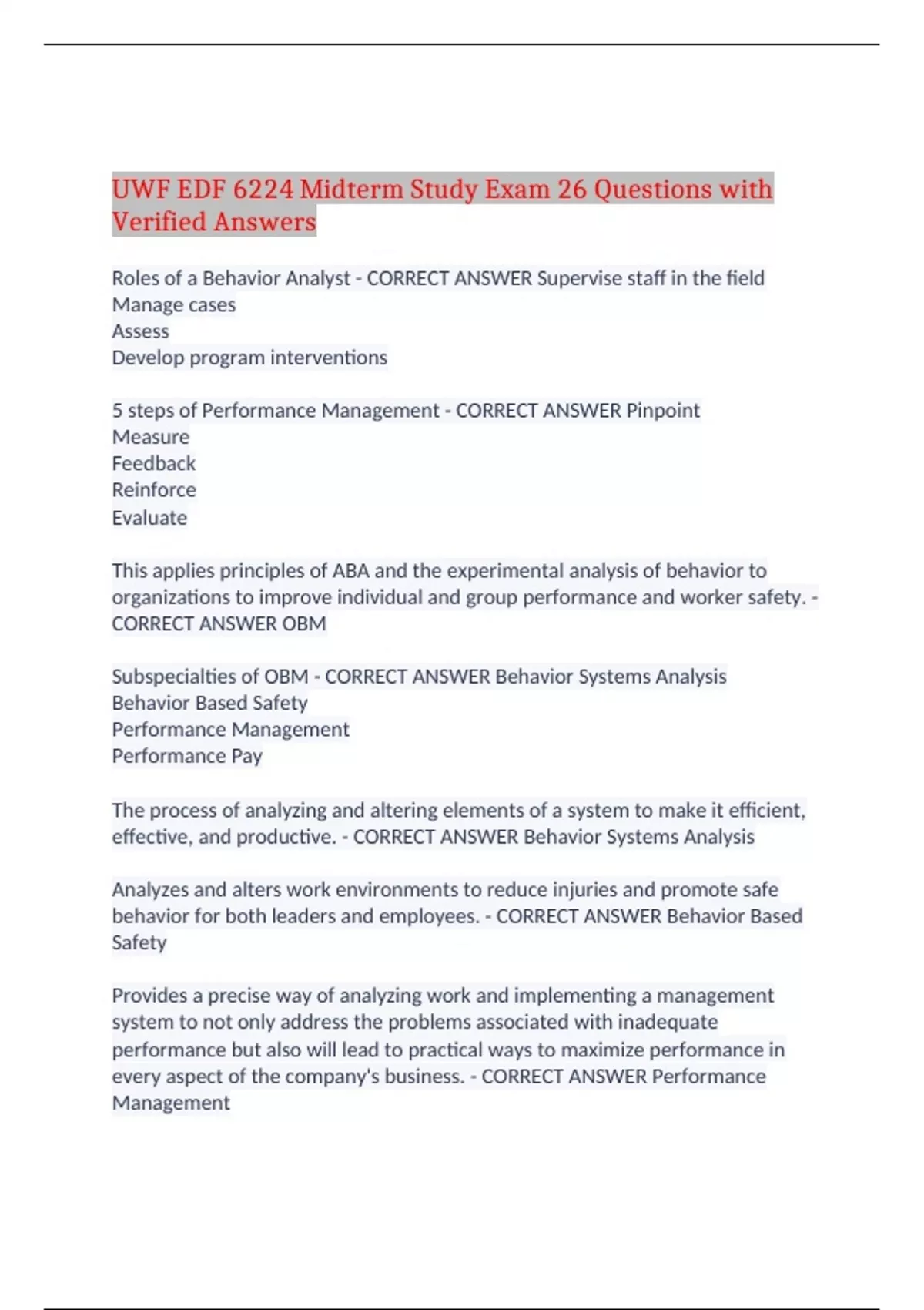 UWF EDF 6224 Midterm Study Exam 26 Questions with Verified Answers Roles of a Behavior Analyst - CORRECT ANSWER Supervise staff in the field Manage cases Assess Develop program interventions 5 steps of Performance Management - CORRECT ANSWER Pinpoint Measure Feedback Reinforce Evaluate This applies principles of ABA and the experimental analysis of behavior to organizations to improve individual and group performance and worker safety. - CORRECT ANSWER OBM Subspecialties of OBM - CORRECT ANSWER Behavior Systems Analysis Behavior Based Safety Performance Management Performance Pay The process of analyzing and altering elements of a system to make it efficient, effective, and productive. - CORRECT ANSWER Behavior Systems Analysis Analyzes and alters work environments to reduce injuries and promote safe behavior for both leaders and employees. - CORRECT ANSWER Behavior Based Safety Provides a precise way of analyzing work and implementing a management system to not only address the problems associated with inadequate performance but also will lead to practical ways to maximize performance in every aspect of the company's business. - CORRECT ANSWER Performance Management Payment based on schedules of reinforcement. Not the same as commission. - CORRECT ANSWER Performance Pay An evidence based approach to teach skills to a criterion. Effective because it relies on defining behavior, measuring behavior, and ensuring a criterion is met. - CORRECT ANSWER Behavioral Skills Training Behavioral Skills Training involves 4 steps: - CORRECT ANSWER Instruction Modeling Rehearsal Feedback Dixon & colleagues (2016), found ________________________ to be the most important variable for behavior analysts when supervising. - CORRECT ANSWER years of experience According to the Dixon et al. study to provide effective supervision a supervisor should provide __________________________________________. - CORRECT ANSWER more supervision hours to each individual Leblanc and Nosik (2019) reported that demand for BACB certificates has increased _____% from . - CORRECT ANSWER 800 According to Reid et al., supervisors have two main functions: When ____________ is needed, the supervisor provides the means to improve performance. When staff performance excels, the supervisor needs to recognize, support and ___________ that performance. - CORRECT ANSWER Improvement maintains According to Reid (2012), the most important variable in training acceptance (i.e. the best part of training) is __________. - CORRECT ANSWER The Topic Leblanc & Nosik (2019) to lead effective meetings: - CORRECT ANSWER Determine format & schedule Establish communication Open the meeting Manage meeting Close the meeting Systematically and objectively observing the quality of staff work. - CORRECT ANSWER Performance Monitoring Two types of monitoring - CORRECT ANSWER Formal and Informal PIC/NIC - CORRECT ANSWER Positive/Negative Immediate/Future Certain/Uncertain 3 ways to lower reactivity to formal staff monitoring? - CORRECT ANSWER Monitor frequently Monitor immediately upon entry Unexpected monitoring What are M&M's, according to Jason Fried? - CORRECT ANSWER Managers & Meetings When conducting a BST session, it is important to do what before it ends? - CORRECT ANSWER Ensure the participants can perform the skill Based on the relative power of consequences from Dr. Aubrey Daniels, what is the best way to provide pay as reinforcement? - CORRECT ANSWER FR schedule for completion of job tasks BST step that requires those participating to practice skills they learned. - CORRECT ANSWER Rehearsal The type of monitoring that involves Scheduling an observation time, alerting the employee, and recording instances of behaviors required to do a job well done. - CORRECT ANSWER Formal monitoring In what way does a pinpoint differ from an operational definition? - CORRECT ANSWER Behavior and the Results