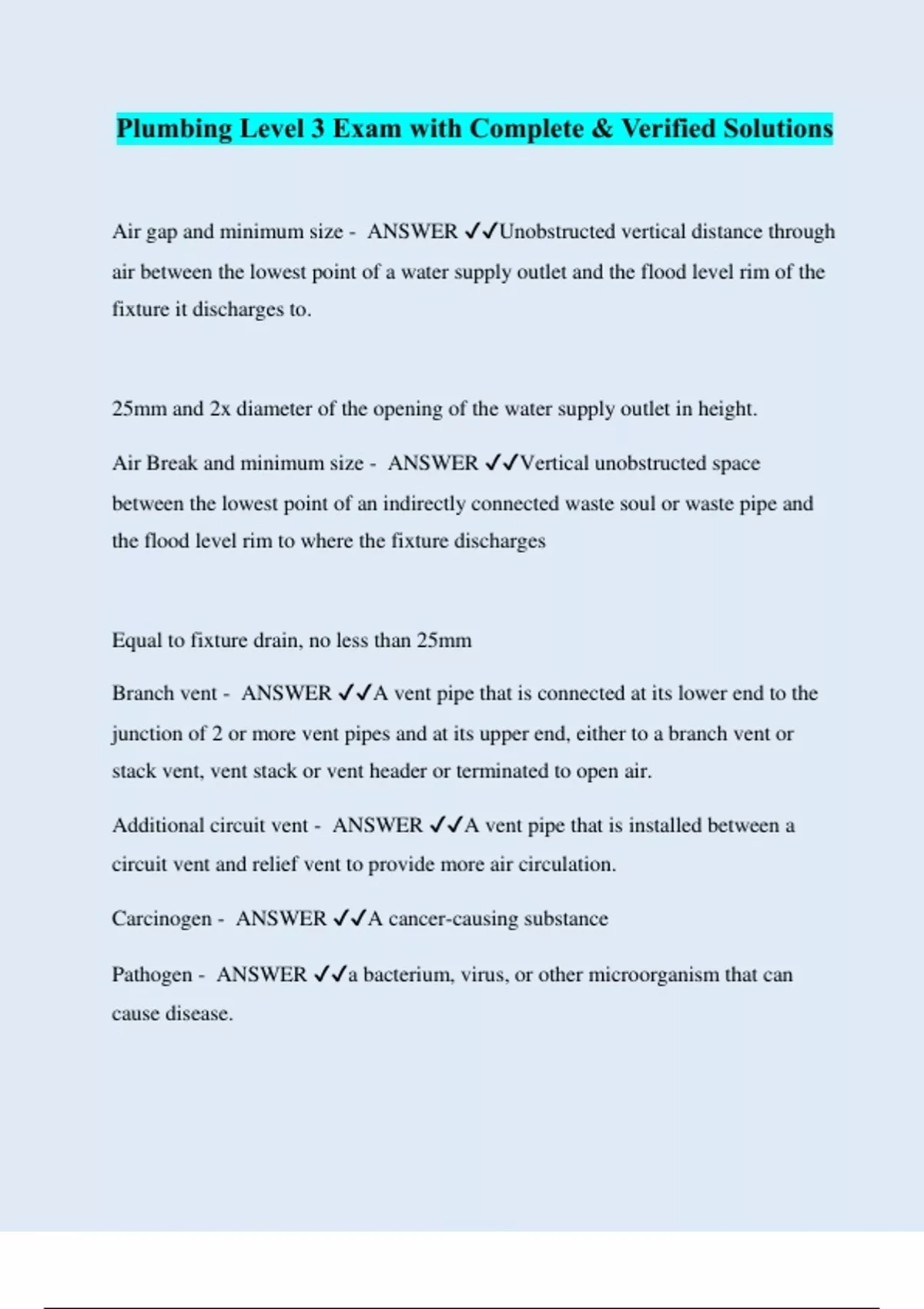 Plumbing Level 3 Exam with Complete & Verified Solutions Air gap and minimum size - ANSWER ️️ Unobstructed vertical distance through air between the lowest point of a water supply outlet and the flood level rim of the fixture it discharges to. 25mm and 2x diameter of the opening of the water supply outlet in height. Air Break and minimum size - ANSWER ️️ Vertical unobstructed space between the lowest point of an indirectly connected waste soul or waste pipe and the flood level rim to where the fixture discharges Equal to fixture drain, no less than 25mm Branch vent - ANSWER ️️ A vent pipe that is connected at its lower end to the junction of 2 or more vent pipes and at its upper end, either to a branch vent or stack vent, vent stack or vent header or terminated to open air. Additional circuit vent - ANSWER ️️ A vent pipe that is installed between a circuit vent and relief vent to provide more air circulation. Carcinogen - ANSWER ️️ A cancer-causing substance Pathogen - ANSWER ️️ a bacterium, virus, or other microorganism that can cause disease.