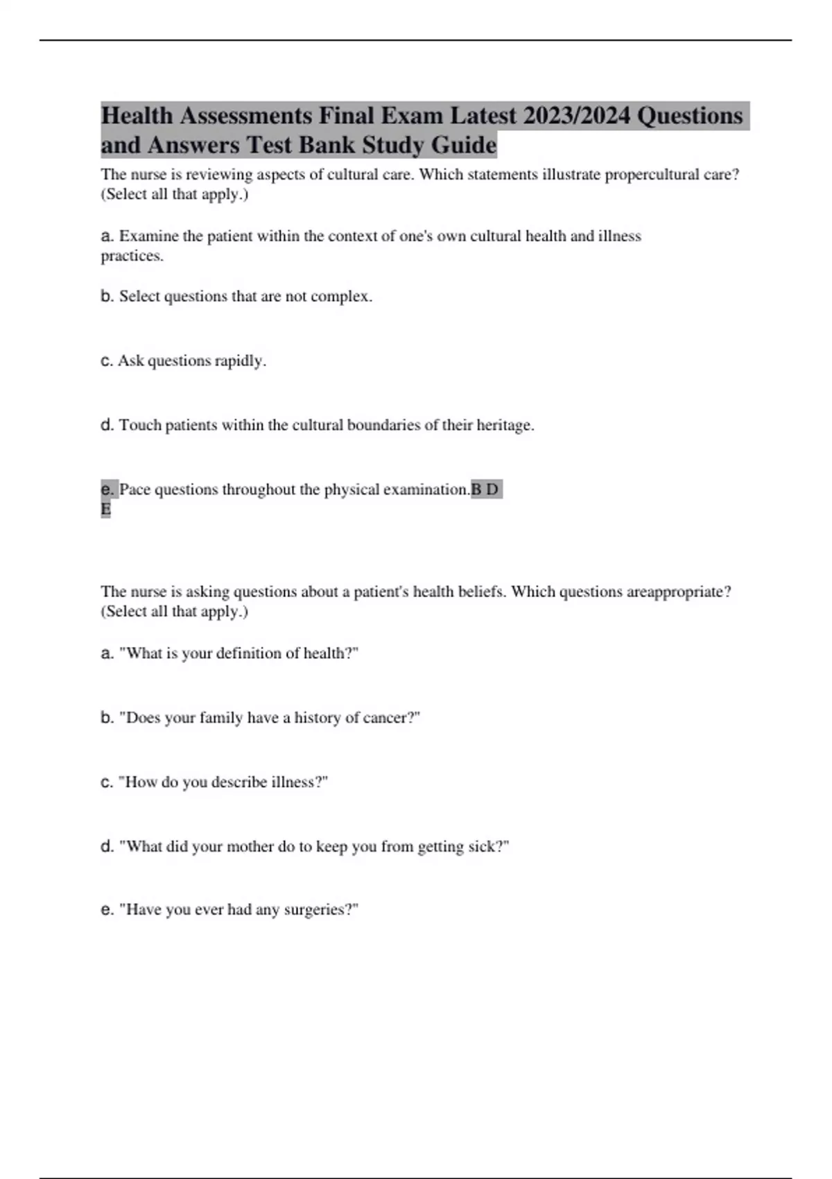 Health Assessments Final Exam Latest 2023/2024 Questions and Answers Test Bank Study Guide