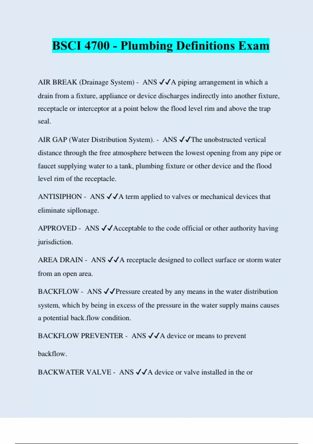 bsci 4700 plumbing definitions exam