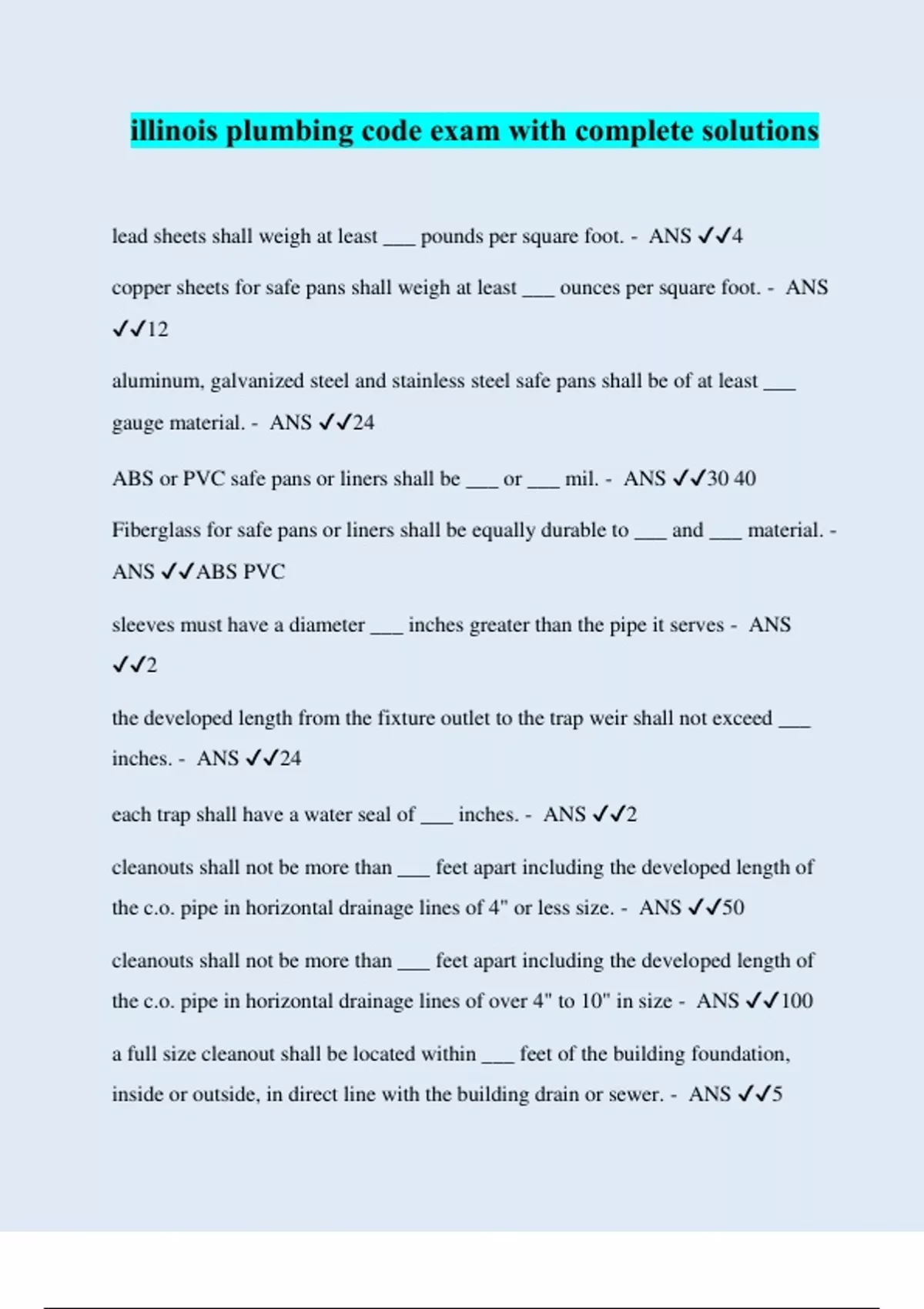 illinois plumbing code exam with complete solutions lead sheets shall weigh at least ___ pounds per square foot. - ANS ️️ 4 copper sheets for safe pans shall weigh at least ___ ounces per square foot. - ANS ️️ 12 aluminum, galvanized steel and stainless steel safe pans shall be of at least ___ gauge material. - ANS ️️ 24 ABS or PVC safe pans or liners shall be ___ or ___ mil. - ANS ️️ 30 40 Fiberglass for safe pans or liners shall be equally durable to ___ and ___ material. - ANS ️️ ABS PVC sleeves must have a diameter ___ inches greater than the pipe it serves - ANS ️️ 2 the developed length from the fixture outlet to the trap weir shall not exceed ___ inches. - ANS ️️ 24 each trap shall have a water seal of ___ inches. - ANS ️️ 2 cleanouts shall not be more than ___ feet apart including the developed length of the c.o. pipe in horizontal drainage lines of 4" or less size. - ANS ️️ 50 cleanouts shall not be more than ___ feet apart including the developed length of the c.o. pipe in horizontal drainage lines of over 4" to 10" in size - ANS ️️ 100 a full size cleanout shall be located within ___ feet of the building foundation, inside or outside, in direct line with the building drain or sewer. - ANS ️️ 5