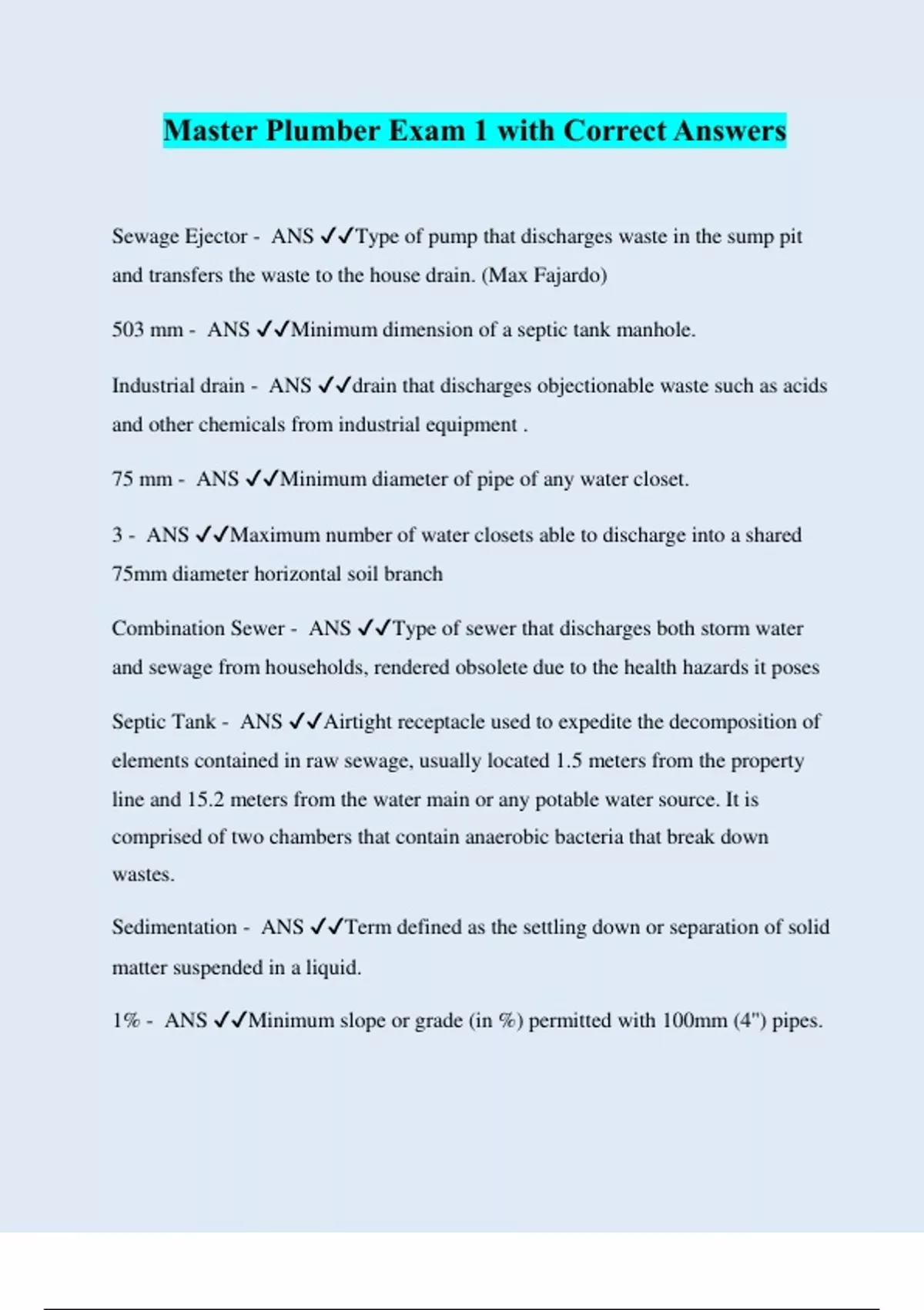 Master Plumber Exam 1 with Correct Answers Sewage Ejector - ANS ️️ Type of pump that discharges waste in the sump pit and transfers the waste to the house drain. (Max Fajardo) 503 mm - ANS ️️ Minimum dimension of a septic tank manhole. Industrial drain - ANS ️️ drain that discharges objectionable waste such as acids and other chemicals from industrial equipment . 75 mm - ANS ️️ Minimum diameter of pipe of any water closet. 3 - ANS ️️ Maximum number of water closets able to discharge into a shared 75mm diameter horizontal soil branch Combination Sewer - ANS ️️ Type of sewer that discharges both storm water and sewage from households, rendered obsolete due to the health hazards it poses Septic Tank - ANS ️️ Airtight receptacle used to expedite the decomposition of elements contained in raw sewage, usually located 1.5 meters from the property line and 15.2 meters from the water main or any potable water source. It is comprised of two chambers that contain anaerobic bacteria that break down wastes. Sedimentation - ANS ️️ Term defined as the settling down or separation of solid matter suspended in a liquid. 1% - ANS ️️ Minimum slope or grade (in %) permitted with 100mm (4'') pipes