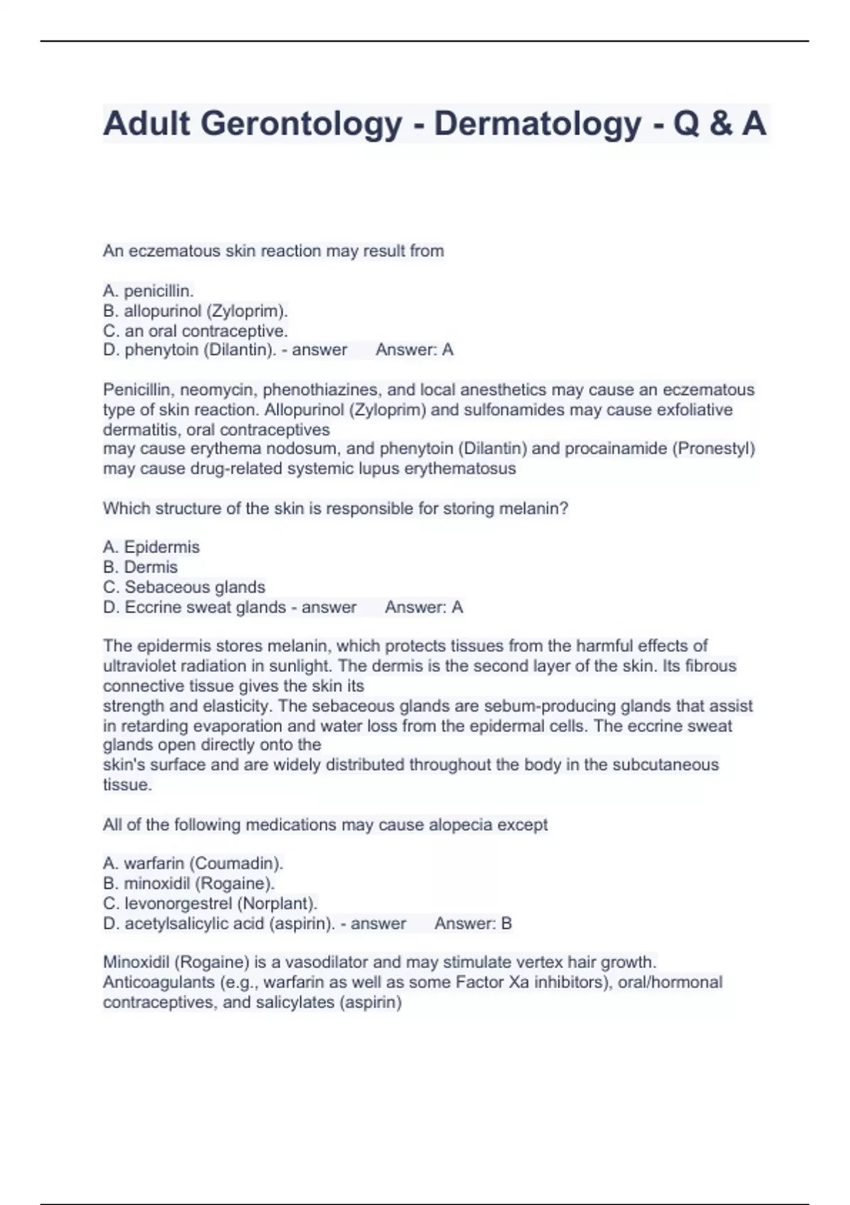 Adult Gerontology - Dermatology - Q & A Questions and Answers Fully solved 2023