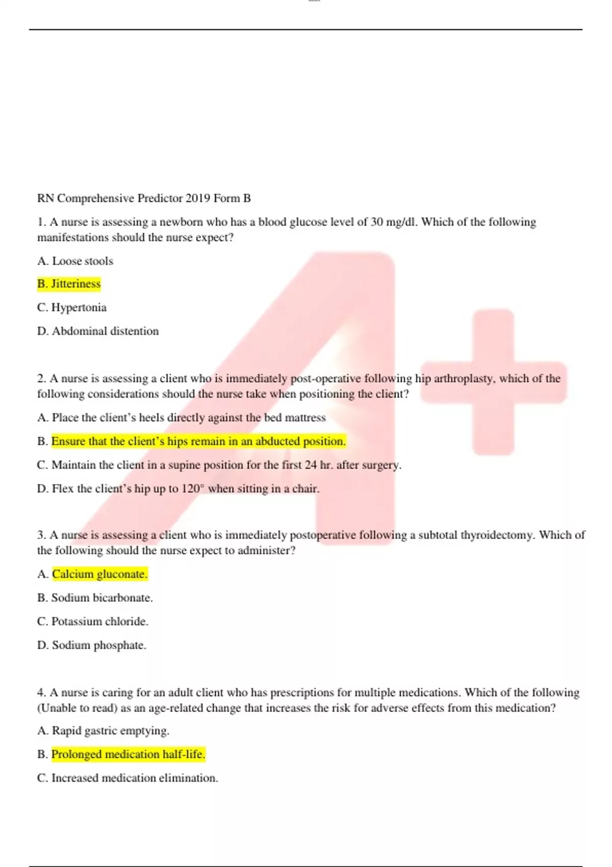 RN Comprehensive Predictor 2019 Form B 1. A nurse is assessing a newborn who has a blood glucose level of 30 mg/dl. Which of the following manifestations should the nurse expect? A. Loose stools B. Jitteriness C. Hypertonia D. Abdominal distention 2. A nurse is assessing a client who is immediately post-operative following hip arthroplasty, which of the following considerations should the nurse take when positioning the client? A. Place the client’s heels directly against the bed mattress B. Ensure that the client’s hips remain in an abducted position. C. Maintain the client in a supine position for the first 24 hr. after surgery. D. Flex the client’s hip up to 120° when sitting in a chair. 3. A nurse is assessing a client who is immediately postoperative following a subtotal thyroidectomy. Which of the following should the nurse expect to administer? A. Calcium gluconate. B. Sodium bicarbonate. C. Potassium chloride. D. Sodium phosphate. 4. A nurse is caring for an adult client who has prescriptions for multiple medications. Which of the following (Unable to read) as an age-related change that increases the risk for adverse effects from this medication? A. Rapid gastric emptying. B. Prolonged medication half-life. C. Increased medication elimination. lOMoAR cPSD| D. Decreased medication sensitivity . lOMoAR cPSD| 5. A nurse manager is planning to promote client advocacy among staff in a medical unit. Which of the following actions should the nurse take? A. Encourage staff to implement the principle of paternalism when a client is having difficulty making a choice. B. Tell staff explain procedures to clients before obtaining informed consent. C. Instruct unit staff to share personal experiences to help clients make decisions. D. Develop a system for staff members to report safety concerns in the client care environment. 6. C 7. A nurse is providing teaching about the gastrostomy tube feedings to the parents of a school age child. Which of the following instructions should the nurse take? A. Administer the feeding over 30 min. B. Place the child in as supine position after the feeding. C. Charge the feeding bag and tubing every 3 days. D. Warm the formula in the microwave prior to administration. 8. A nurse is administering digoxin 0.125 mg Po to an adult client. For which of the following findings should the nurse report to the provider? A. Potassium level 4.2 mEq/L. B. Apical pulse 58/min. C. Digoxin level 1 ng/ml. D. Constipation for 2 days. lOMoAR cPSD| 9. A 10.A nurse is caring for an adolescent who has sickle-cell anemia. Which of the following manifestations indicates acute chest syndrome and should be immediately reported to the provider? A. Substernal retractions. B. Hematuria. C. Temperature 37.9 C (100.2 F). D. Sneezing. 11. C 12. A nurse is preforming a gastric lavage for a client who has upper gastrointestinal bleeding. Which of the following action should the nurse take? A. Instill 500 ml of solution through the NG tube. B. Insert a large-bore NG tube. C. Use a cold irrigation solution. D. Instruct the client to lie on his right side. lOMoAR cPSD| 13. A nurse is providing care for a client who is in the advance stage of amyotrophic lateral sclerosis. (ALS). Which of the following referrals is the nurse’s priority? A. Psychologist. B. Social worker. C. Occupational therapist. D. Speech-language pathologist. 14.A nurse is reviewing the laboratory results of a client who has rheumatoid arthritis. Which of the following findings should the nurse report to the provider? A. WBC count 8,000/mm3. B. Platelets 150,000/mm3. C. Aspartate aminotransferase 10 units/L. D. Erythrocyte sedimentation rate 75 mm/hr 15. A nurse is caring for a client who has generalized petechiae and ecchymoses. The nurse should expect a prescription for which of the following laboratory tests? A. Platelet count. B. Potassium level. C. Creatine clearanc