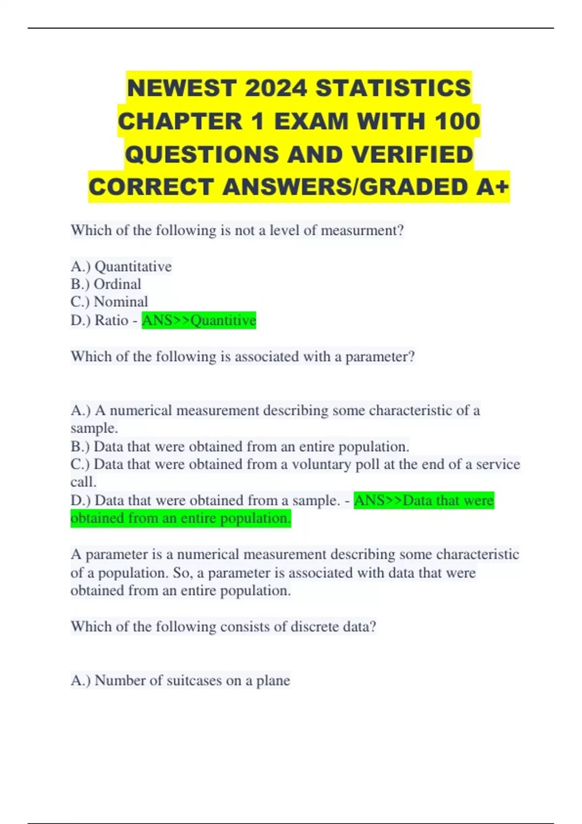 Which of the following is not a level of measurment? A.) Quantitative B.) Ordinal C.) Nominal D.) Ratio - ANS>>Quantitive Which of the following is associated with a parameter? A.) A numerical measurement describing some characteristic of a sample. B.) Data that were obtained from an entire population. C.) Data that were obtained from a voluntary poll at the end of a service call. D.) Data that were obtained from a sample. - ANS>>Data that were obtained from an entire population.