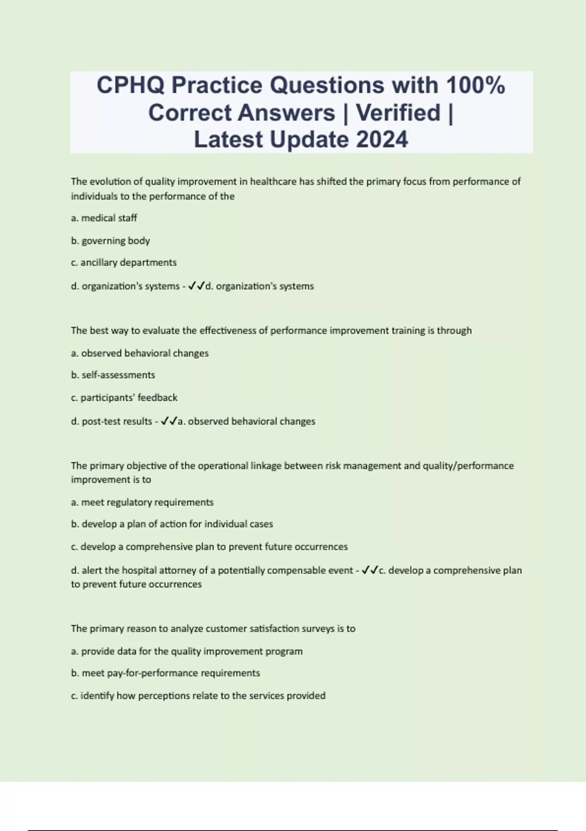 CPHQ Practice Questions with 100% Correct Answers | Verified | Latest Update 2024 | 33 Pages