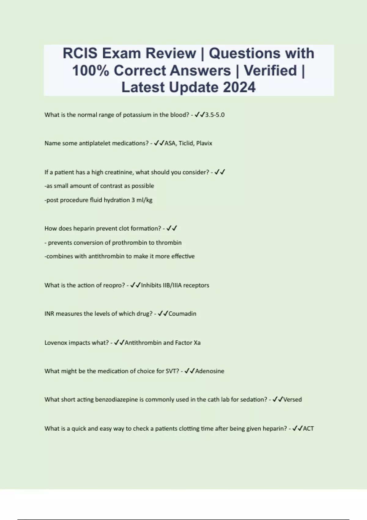 What is the normal range of potassium in the blood? - 3.5-5.0 Name some antiplatelet medications? - ASA, Ticlid, Plavix If a patient has a high creatinine, what should you consider? - -as small amount of contrast as possible -post procedure fluid hydration 3 ml/kg How does heparin prevent clot formation? - - prevents conversion of prothrombin to thrombin -combines with antithrombin to make it more effective What is the action of reopro? - Inhibits IIB/IIIA receptors INR measures the levels of which drug? - Coumadin Lovenox impacts what? - Antithrombin and Factor Xa What might be the medication of choice for SVT? - Adenosine
