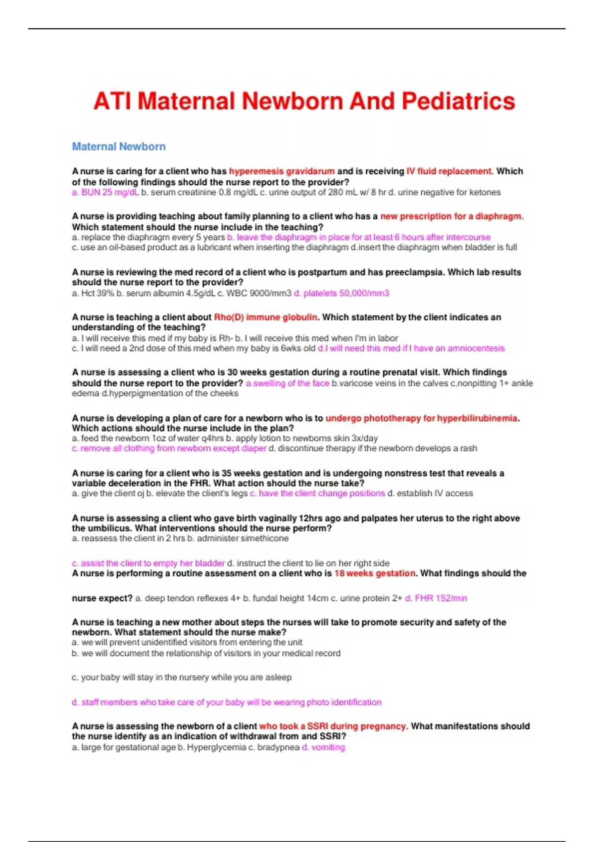 ATI Maternal Newborn And Pediatrics A nurse is caring for a client who has hyperemesis gravidarum and is receiving IV fluid replacement. Which of the following findings should the nurse report to the provider? a. BUN 25 mg/dL b. serum creatinine 0.8 mg/dL c. urine output of 280 mL w/ 8 hr d. urine negative for ketones A nurse is providing teaching about family planning to a client who has a new prescription for a diaphragm. Which statement should the nurse include in the teaching? a. replace the diaphragm every 5 years b. leave the diaphragm in place for at least 6 hours after intercourse c. use an oil-based product as a lubricant when inserting the diaphragm t the diaphragm when bladder is full A nurse is reviewing the med record of a client who is postpartum and has preeclampsia. Which lab results should the nurse report to the provider? a. Hct 39% b. serum albumin 4.5g/dL c. WBC 9000/mm3 d. platelets 50,000/mm3 A nurse is teaching a client about Rho(D) immune globulin. Which statement by the client indicates an understanding of the teaching? a. I will receive this med if my baby is Rh- b. I will receive this med when I'm in labor c. I will need a 2nd dose of this med when my baby is 6wks old d.I will need this med if I have an amniocentesis A nurse is assessing a client who is 30 weeks gestation during a routine prenatal visit. Which findings should the nurse report to the provider? ing of the face ose veins in the calves tting 1+ ankle edema pigmentation of the cheeks A nurse is developing a plan of care for a newborn who is to undergo phototherapy for hyperbilirubinemia. Which actions should the nurse include in the plan? a. feed the newborn 1oz of water q4hrs b. apply lotion to newborns skin 3x/day c. remove all clothing from newborn except diaper d. discontinue therapy if the newborn develops a rash A nurse is caring for a client who is 35 weeks gestation and is undergoing nonstress test that reveals a variable deceleration in the FHR. What action should the nurse take? a. give the client oj b. elevate the client's legs c. have the client change positions d. establish IV access A nurse is assessing a client who gave birth vaginally 12hrs ago and palpates her uterus to the right above the umbilicus. What interventions should the nurse perform? a. reassess the client in 2 hrs b. administer simethicone