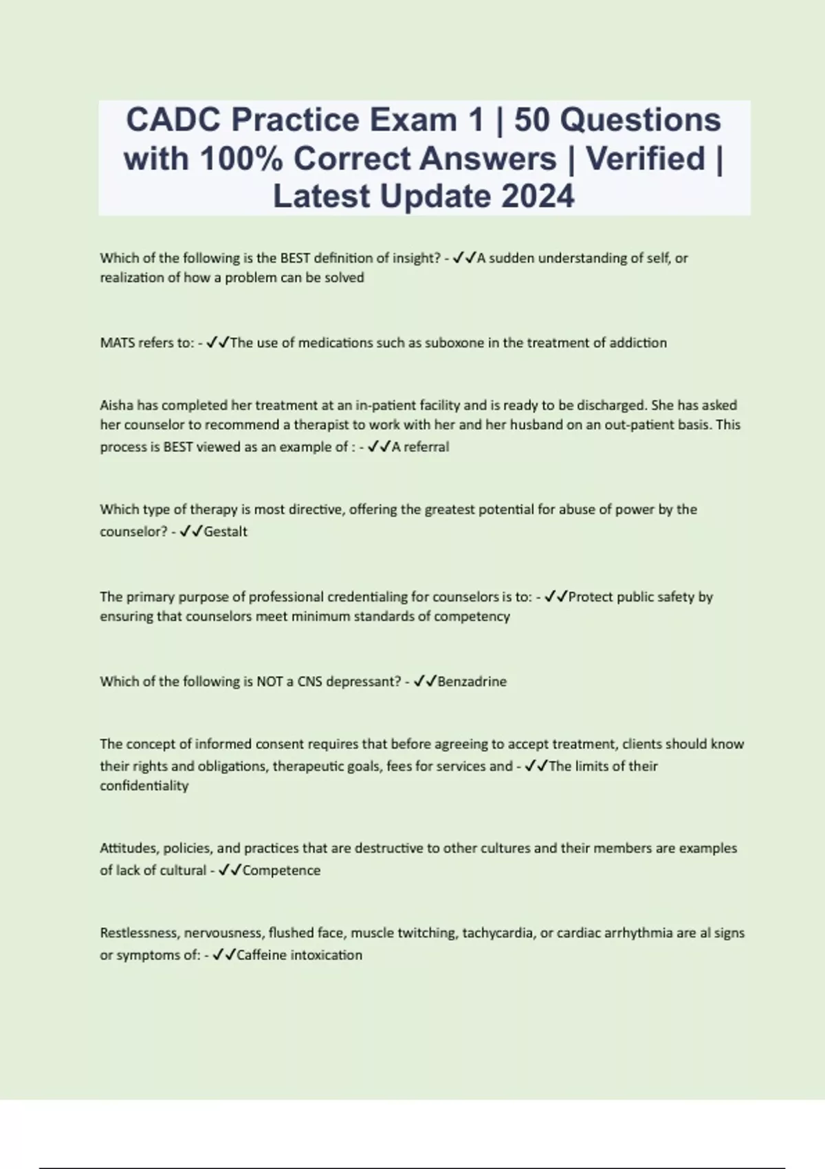 Which of the following is the BEST definition of insight? - A sudden understanding of self, or realization of how a problem can be solved MATS refers to: - The use of medications such as suboxone in the treatment of addiction Aisha has completed her treatment at an in-patient facility and is ready to be discharged. She has asked her counselor to recommend a therapist to work with her and her husband on an out-patient basis. This process is BEST viewed as an example of : - A referral Which type of therapy is most directive, offering the greatest potential for abuse of power by the counselor? - Gestalt The primary purpose of professional credentialing for counselors is to: - Protect public safety by ensuring that counselors meet minimum standards of competency Which of the following is NOT a CNS depressant? - Benzadrine The concept of informed consent requires that before agreeing to accept treatment, clients should know their rights and obligations, therapeutic goals, fees for services and - The limits of their confidentiality Attitudes, policies, and practices that are destructive to other cultures and their members are examples of lack of cultural - Competence Restlessness, nervousness, flushed face, muscle twitching, tachycardia, or cardiac arrhythmia are al signs or symptoms of: - Caffeine intoxication