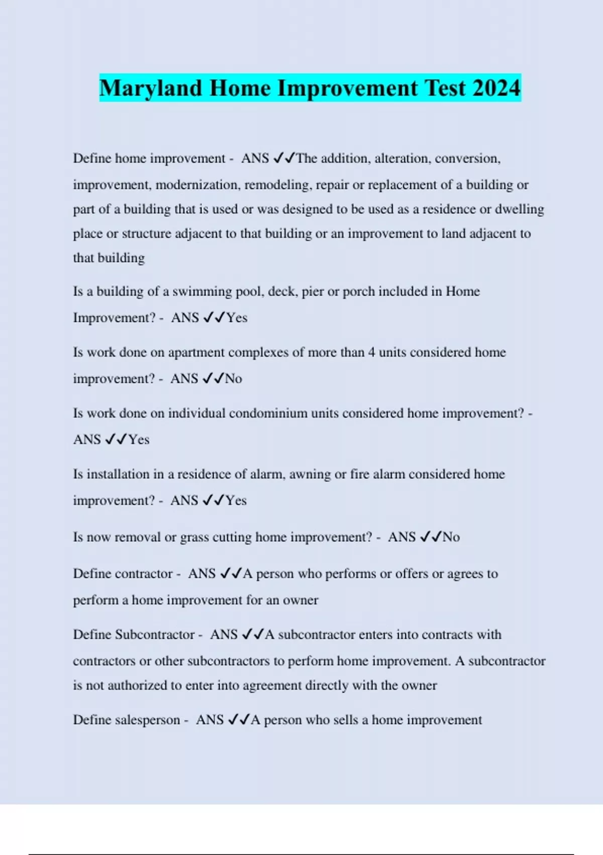 Maryland Home Improvement Test 2024 Define home improvement - ANS ️️ The addition, alteration, conversion, improvement, modernization, remodeling, repair or replacement of a building or part of a building that is used or was designed to be used as a residence or dwelling place or structure adjacent to that building or an improvement to land adjacent to that building Is a building of a swimming pool, deck, pier or porch included in Home Improvement? - ANS ️️ Yes Is work done on apartment complexes of more than 4 units considered home improvement? - ANS ️️ No Is work done on individual condominium units considered home improvement? - ANS ️️ Yes Is installation in a residence of alarm, awning or fire alarm considered home improvement? - ANS ️️ Yes Is now removal or grass cutting home improvement? - ANS ️️ No Define contractor - ANS ️️ A person who performs or offers or agrees to perform a home improvement for an owner Define Subcontractor - ANS ️️ A subcontractor enters into contracts with contractors or other subcontractors to perform home improvement. A subcontractor is not authorized to enter into agreement directly with the owner Define salesperson - ANS ️️ A person who sells a home improvemen