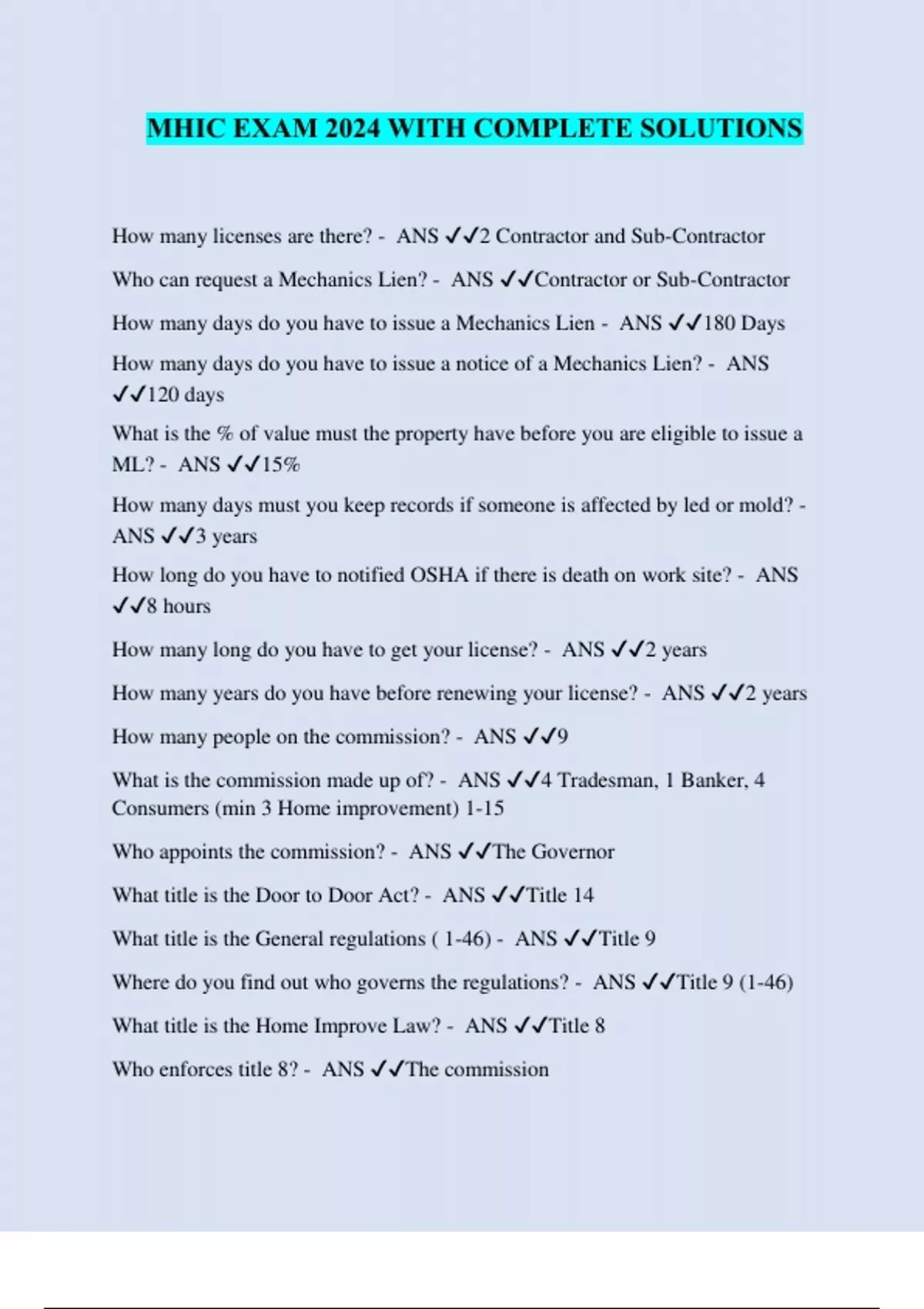 MHIC EXAM 2024 WITH COMPLETE SOLUTIONS How many licenses are there? - ANS ️️ 2 Contractor and Sub-Contractor Who can request a Mechanics Lien? - ANS ️️ Contractor or Sub-Contractor How many days do you have to issue a Mechanics Lien - ANS ️️ 180 Days How many days do you have to issue a notice of a Mechanics Lien? - ANS ️️ 120 days What is the % of value must the property have before you are eligible to issue a ML? - ANS ️️ 15% How many days must you keep records if someone is affected by led or mold? - ANS ️️ 3 years How long do you have to notified OSHA if there is death on work site? - ANS ️️ 8 hours How many long do you have to get your license? - ANS ️️ 2 years How many years do you have before renewing your license? - ANS ️️ 2 years How many people on the commission? - ANS ️️ 9 What is the commission made up of? - ANS ️️ 4 Tradesman, 1 Banker, 4 Consumers (min 3 Home improvement) 1-15