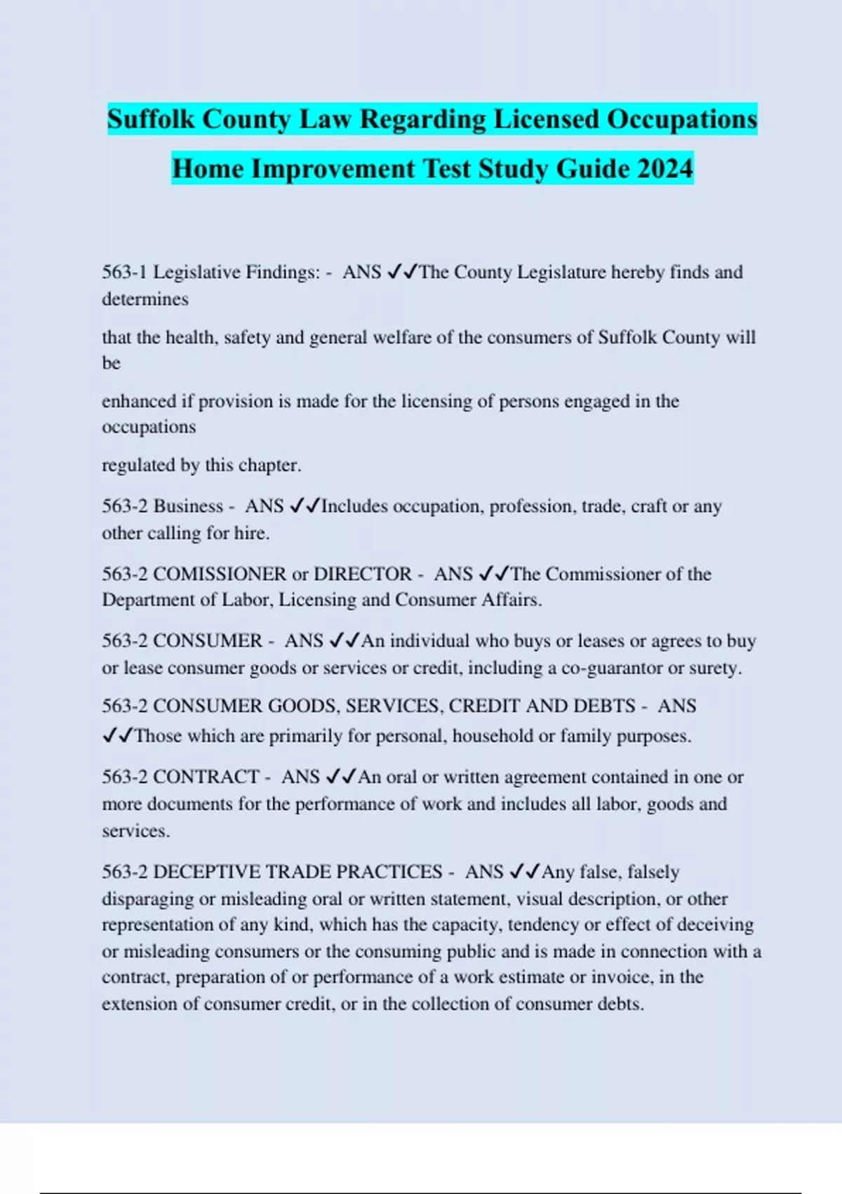 Suffolk County Law Regarding Licensed Occupations Home Improvement Test Study Guide 2024 563-1 Legislative Findings: - ANS ️️ The County Legislature hereby finds and determines that the health, safety and general welfare of the consumers of Suffolk County will be enhanced if provision is made for the licensing of persons engaged in the occupations regulated by this chapter. 563-2 Business - ANS ️️ Includes occupation, profession, trade, craft or any other calling for hire. 563-2 COMISSIONER or DIRECTOR - ANS ️️ The Commissioner of the Department of Labor, Licensing and Consumer Affairs. 563-2 CONSUMER - ANS ️️ An individual who buys or leases or agrees to buy or lease consumer goods or services or credit, including a co-guarantor or surety. 563-2 CONSUMER GOODS, SERVICES, CREDIT AND DEBTS - ANS ️️ Those which are primarily for personal, household or family purposes. 563-2 CONTRACT - ANS ️️ An oral or written agreement contained in one or more documents for the performance of work and includes all labor, goods and services. 563-2 DECEPTIVE TRADE PRACTICES - ANS ️️ Any false, falsely disparaging or misleading oral or written statement, visual description, or other representation of any kind, which has the capacity, tendency or effect of deceiving or misleading consumers or the consuming public and is made in connection with a contract, preparation of or performance of a work estimate or invoice, in the extension of consumer credit, or in the collection of consumer debts.