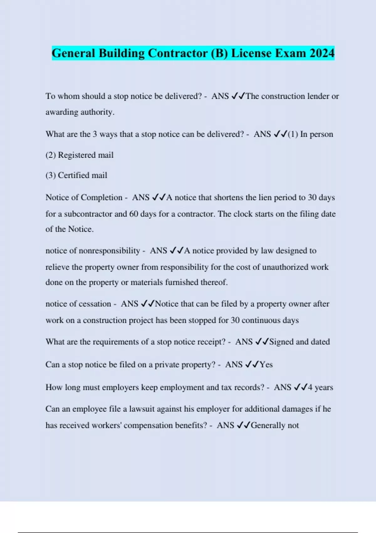 General Building Contractor (B) License Exam 2024 To whom should a stop notice be delivered? - ANS ️️ The construction lender or awarding authority. What are the 3 ways that a stop notice can be delivered? - ANS ️️ (1) In person (2) Registered mail (3) Certified mail Notice of Completion - ANS ️️ A notice that shortens the lien period to 30 days for a subcontractor and 60 days for a contractor. The clock starts on the filing date of the Notice. notice of nonresponsibility - ANS ️️ A notice provided by law designed to relieve the property owner from responsibility for the cost of unauthorized work done on the property or materials furnished thereof. notice of cessation - ANS ️️ Notice that can be filed by a property owner after work on a construction project has been stopped for 30 continuous days What are the requirements of a stop notice receipt? - ANS ️️ Signed and dated Can a stop notice be filed on a private property? - ANS ️️ Yes How long must employers keep employment and tax records? - ANS ️️ 4 years Can an employee file a lawsuit against his employer for additional damages if he has received workers' compensation benefits? - ANS ️️ Generally not A prime contractor is legally responsible for ensuring that its subcontractors have workers' compensation insurance for their employees. True or False? - ANS ️️ True. What may happen to a prime contractor if his subcontractor didn't offer worker's comp? - ANS ️️ The prime contractor may be held liable in a lawsuit filed by a subcontractor's injured employee. Group membership - ANS ️️ Race, religion, color, national origin, ancestry, or sex Who enforces the California Labor Code? - ANS ️️ The Division of Labor Standards Enforcement within the Department of Industrial Relations What should an employee do if he gets injured on the job? - ANS ️️ He should notify his employer in writing within 30 days. If an employer disputes an employee's claim for workers' compensation, does the burden of proof rest on the employer or employee? - ANS ️️ The employer Which governing body hears workers' compensation benefit disputes? - ANS ️️ Workers' Compensation Appeals Board What is the penalty for employers' who do not obtain the required workers' compensation insurance? - ANS ️️ 1) $2000 per employee if no injuries have occurred 2) $10,000 per employee if injuries have occurred, up to a maximum of $100,000 Describe the degree of access the Division of Labor Standards Enforcement has to places of employment in CA. - ANS ️️ The Division has the right to free acce