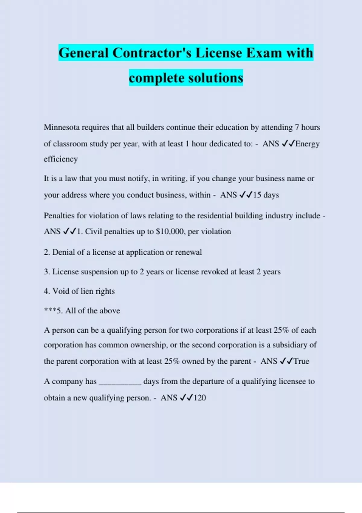 General Contractor's License Exam with complete solutions Minnesota requires that all builders continue their education by attending 7 hours of classroom study per year, with at least 1 hour dedicated to: - ANS ️️ Energy efficiency It is a law that you must notify, in writing, if you change your business name or your address where you conduct business, within - ANS ️️ 15 days Penalties for violation of laws relating to the residential building industry include - ANS ️️ 1. Civil penalties up to $10,000, per violation 2. Denial of a license at application or renewal 3. License suspension up to 2 years or license revoked at least 2 years 4. Void of lien rights ***5. All of the above A person can be a qualifying person for two corporations if at least 25% of each corporation has common ownership, or the second corporation is a subsidiary of the parent corporation with at least 25% owned by the parent - ANS ️️ True A company has __________ days from the departure of a qualifying licensee to obtain a new qualifying person. - ANS ️️ 120