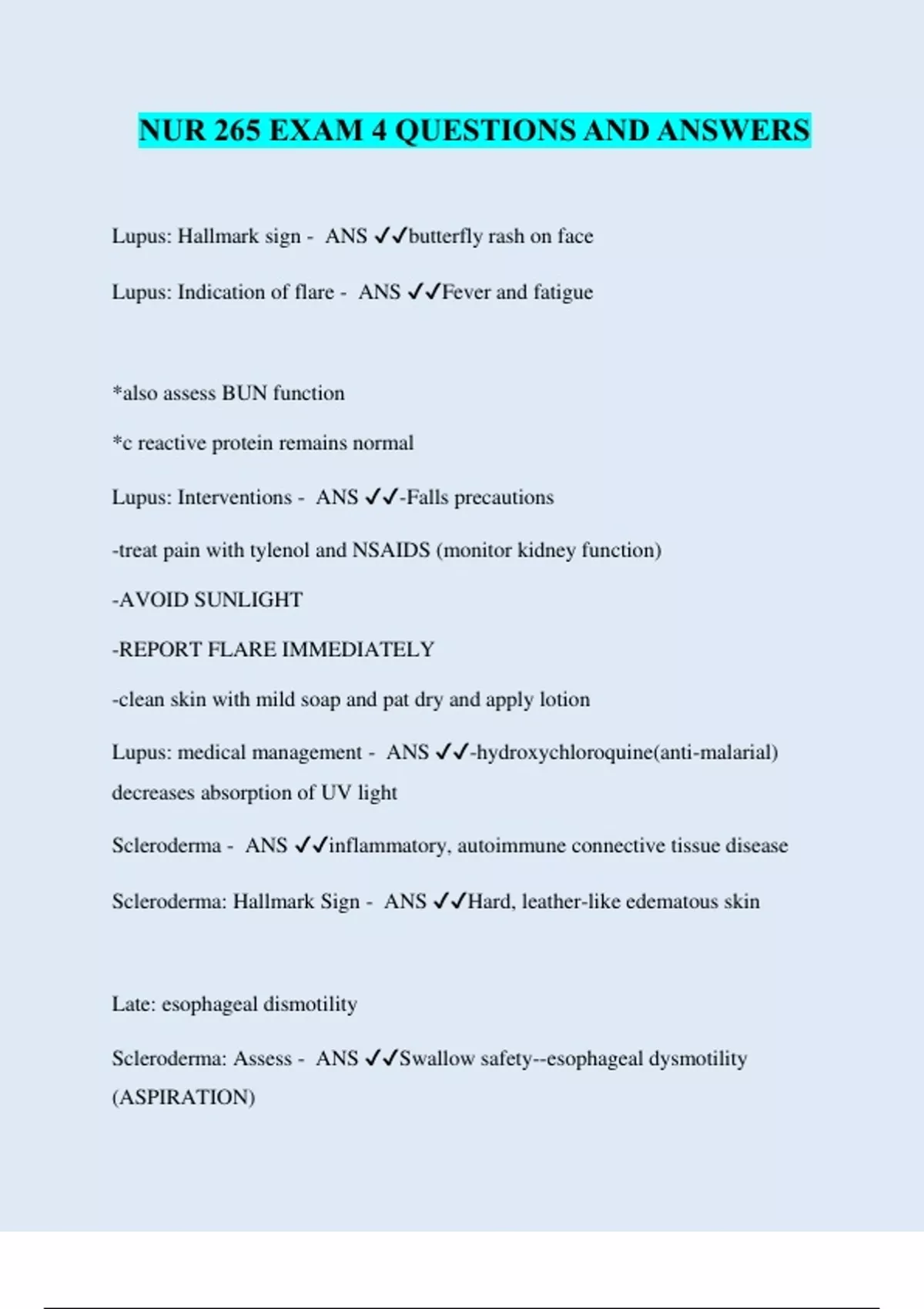 NUR 265 EXAM 4 QUESTIONS AND ANSWERS Lupus: Hallmark sign - ANS ️️ butterfly rash on face Lupus: Indication of flare - ANS ️️ Fever and fatigue *also assess BUN function *c reactive protein remains normal Lupus: Interventions - ANS ️️ -Falls precautions -treat pain with tylenol and NSAIDS (monitor kidney function) -AVOID SUNLIGHT -REPORT FLARE IMMEDIATELY -clean skin with mild soap and pat dry and apply lotion Lupus: medical management - ANS ️️ -hydroxychloroquine(anti-malarial) decreases absorption of UV light Scleroderma - ANS ️️ inflammatory, autoimmune connective tissue disease Scleroderma: Hallmark Sign - ANS ️️ Hard, leather-like edematous skin Late: esophageal dismotility Scleroderma: Assess - ANS ️️ Swallow safety--esophageal dysmotility (ASPIRATION) O2 circulation skin Scleroderma: Interventions - ANS ️️ aspiration precautions (keep HOB at 60 degrees during meals and after) skin protection measures small frequent meals--avoid caffeine and alcohol -avoid spices, caffeine and pepper fibromyalgia: S/sx - ANS ️️ extreme fatigure GI symptoms dysuria blurred vision forgetfulness fibromyalgia: Assess - ANS ️️ pain level extreme fatigue GI symptoms Fibromyalgia: Interventions - ANS ️️ NSAIDS Nuerontin (gabapentin) Lyrica (pregabalin) SNRI and tricyclic antidepressants (amitripty