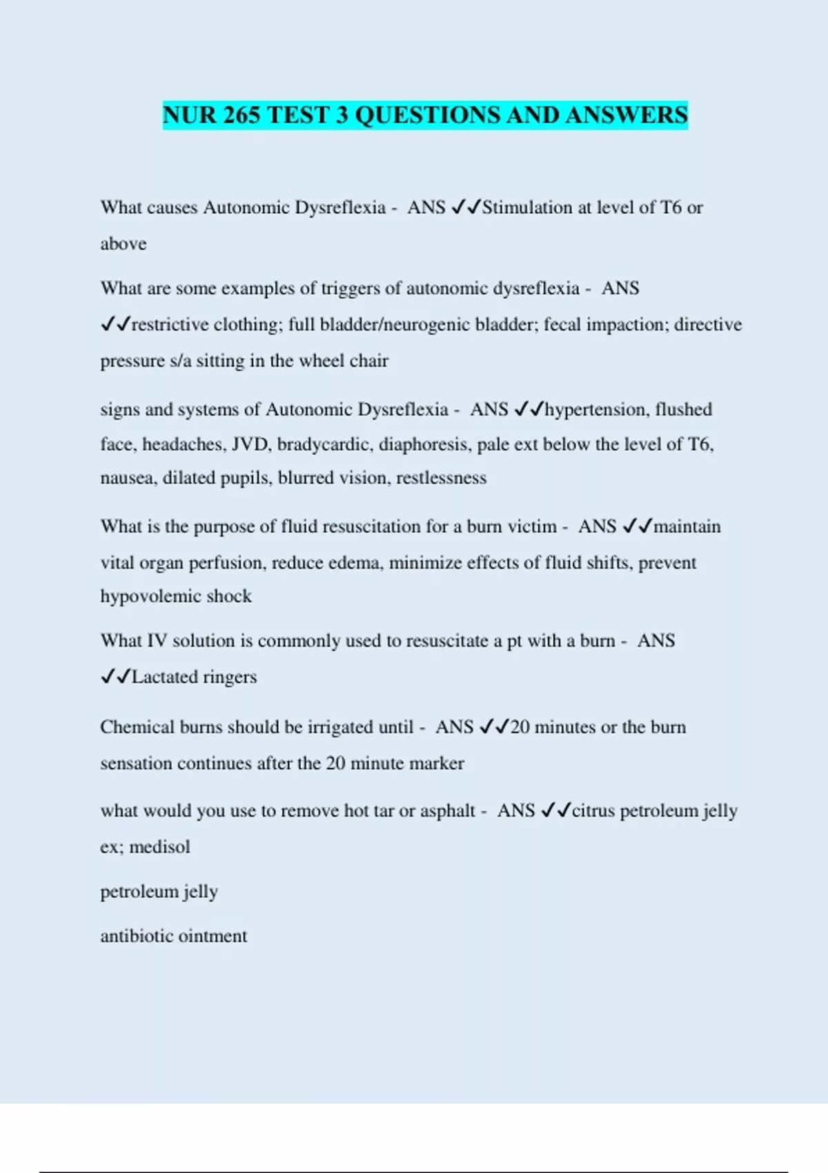 NUR 265 TEST 3 QUESTIONS AND ANSWERS What causes Autonomic Dysreflexia - ANS ️️ Stimulation at level of T6 or above What are some examples of triggers of autonomic dysreflexia - ANS ️️ restrictive clothing; full bladder/neurogenic bladder; fecal impaction; directive pressure s/a sitting in the wheel chair signs and systems of Autonomic Dysreflexia - ANS ️️ hypertension, flushed face, headaches, JVD, bradycardic, diaphoresis, pale ext below the level of T6, nausea, dilated pupils, blurred vision, restlessness What is the purpose of fluid resuscitation for a burn victim - ANS ️️ maintain vital organ perfusion, reduce edema, minimize effects of fluid shifts, prevent hypovolemic shock What IV solution is commonly used to resuscitate a pt with a burn - ANS ️️ Lactated ringers Chemical burns should be irrigated until - ANS ️️ 20 minutes or the burn sensation continues after the 20 minute marker what would you use to remove hot tar or asphalt - ANS ️️ citrus petroleum jelly ex; medisol petroleum jelly antibiotic ointment what kind of brain injury would you expect if an adult client is positive for Palmer's infant reflexes - ANS ️️ cortical and premotor cortex damage what kind of brain injury would you expect if an adult client is positive for plantar infant reflexes - ANS ️️ upper motor neuron lesion what kind of brain injury would you expect if an adult client is positive for rooting infant reflex - ANS ️️ frontal lobe damage what kind of brain injury would you expect if an adult client is positive for sucking infant reflex - ANS ️️ Advance dementia; cortical brain damage what kind of brain injury would you expect if an adult client is positive for glabella (persistent blinking) infant reflex - ANS ️️ diffuse cortical dysfunction What is the consensus formula for burns - ANS ️️ 2-4 ml X TBSA X KG What S&S are expected for a burn client who is receiving the first 8 hours of fluid resuscitation - ANS ️️ Restlessness, anxiety, Hypothermia how much fluid replacement are you going to give the first 8 hours - ANS ️️ 1/2 of the fluid consensus What do you need to monitor when resuscitating fluids for burn pt to make sure that it is working - ANS ️️ Urine outpu