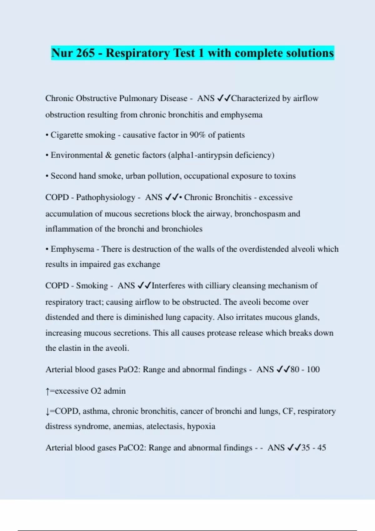Nur 265 - Respiratory Test 1 with complete solutions Chronic Obstructive Pulmonary Disease - ANS ️️ Characterized by airflow obstruction resulting from chronic bronchitis and emphysema • Cigarette smoking - causative factor in 90% of patients • Environmental & genetic factors (alpha1-antirypsin deficiency) • Second hand smoke, urban pollution, occupational exposure to toxins COPD - Pathophysiology - ANS ️️ • Chronic Bronchitis - excessive accumulation of mucous secretions block the airway, bronchospasm and inflammation of the bronchi and bronchioles • Emphysema - There is destruction of the walls of the overdistended alveoli which results in impaired gas exchange COPD - Smoking - ANS ️️ Interferes with cilliary cleansing mechanism of respiratory tract; causing airflow to be obstructed. The aveoli become over distended and there is diminished lung capacity. Also irritates mucous glands, increasing mucous secretions. This all causes protease release which breaks down the elastin in the aveoli. Arterial blood gases PaO2: Range and abnormal findings - ANS ️️ 80 - 100 ↑=excessive O2 admin ↓=COPD, asthma, chronic bronchitis, cancer of bronchi and lungs, CF, respiratory distress syndrome, anemias, atelectasis, hypoxia Arterial blood gases PaCO2: Range and abnormal findings - - ANS ️️ 35 - 45