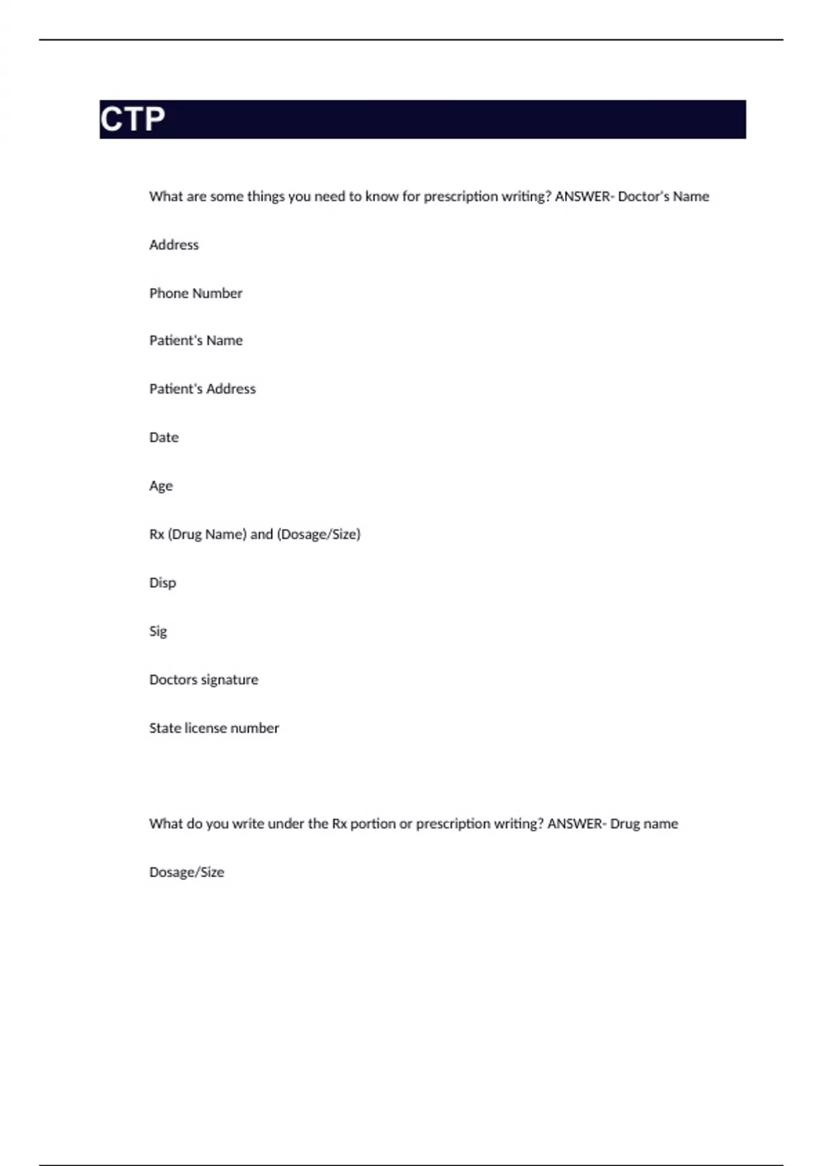 CTP What are some things you need to know for prescription writing? ANSWER- Doctor's Name Address Phone Number Patient's Name Patient's Address Date Age Rx (Drug Name) and (Dosage/Size) Disp Sig Doctors signature State license number
