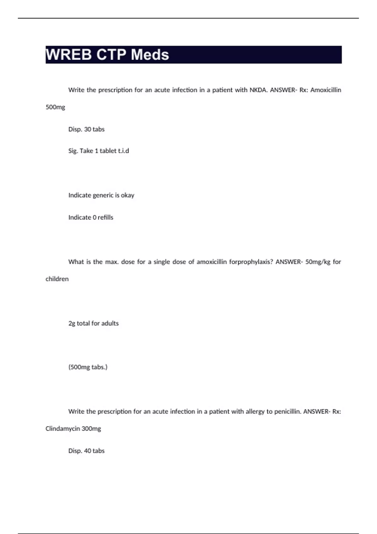 WREB CTP Meds Write the prescription for an acute infection in a patient with NKDA. ANSWER- Rx: Amoxicillin 500mg Disp. 30 tabs Sig. Take 1 tablet t.i.d Indicate generic is okay Indicate 0 refills What is the max. dose for a single dose of amoxicillin forprophylaxis? ANSWER- 50mg/kg for children 2g total for adults (500mg tabs.) Write the prescription for an acute infection in a patient with allergy to penicillin. ANSWER- Rx: Clindamycin 300mg Disp. 40 tabs