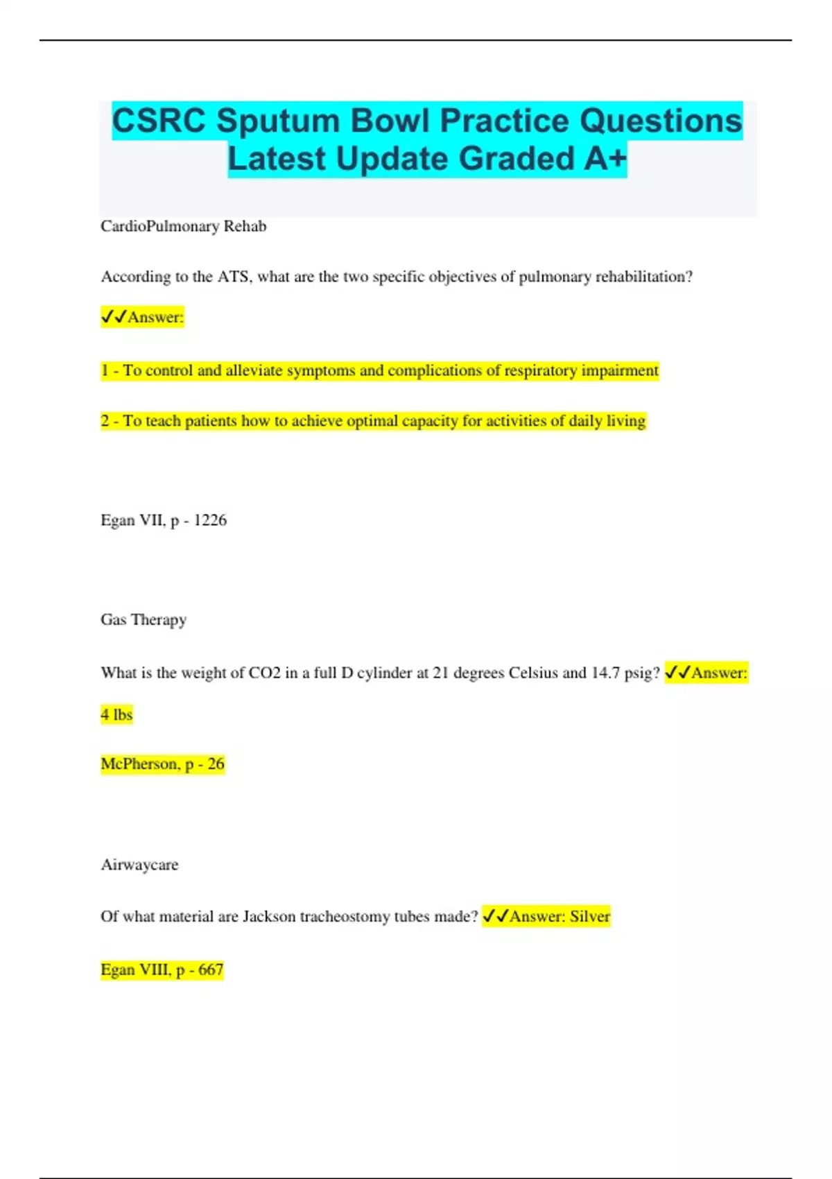 CSRC Sputum Bowl Practice Questions Latest Update Graded A+ CardioPulmonary Rehab According to the ATS, what are the two specific objectives of pulmonary rehabilitation? Answer: 1 - To control and alleviate symptoms and complications of respiratory impairment 2 - To teach patients how to achieve optimal capacity for activities of daily living Egan VII, p - 1226 Gas Therapy What is the weight of CO2 in a full D cylinder at 21 degrees Celsius and 14.7 psig? Answer: 4 lbs McPherson, p - 26 Airwaycare Of what material are Jackson tracheostomy tubes made? Answer: Silver Egan VIII, p - 667 Pathology Alpha-1 antitrypsin deficiency is a hereditary disorder associated with what lung disease? Answer: Emphysema Egan VII, p - 473 Pharmacology How does beta2 adrenergic stimulation effect vascular smooth muscle? Answer: causes vasodilation Rau, p - 143 Diagnostics The ATS publishes standards for the performance of diagnostic spirometers. What is the "ATS"? Answer: the American Thoracic Society Egan VII, 394 Anatomy & Physiology How much anatomic deadspace would a normal 150 pound man have? Answer: 150 mL Egan VII, p - 258 Diagnostics What is the most common way to measure basal energy expenditure? Answer: Indirect Calorimetry Wilkins V, p - 346 Pathology What is the source of the sound energy for wheezes? Answer: Vibration of the wall of a narrowed or compressed airway. Wilkins V, p - 79 Anatomy & Physiology What are the normal PO2 and PCO2 in the fetal umbilical artery? Answer: PO2 - 19 ( 17 - 21 ) PCO2 - 47 ( 42 - 52 ) Egan V, p - 157 Diagnostics