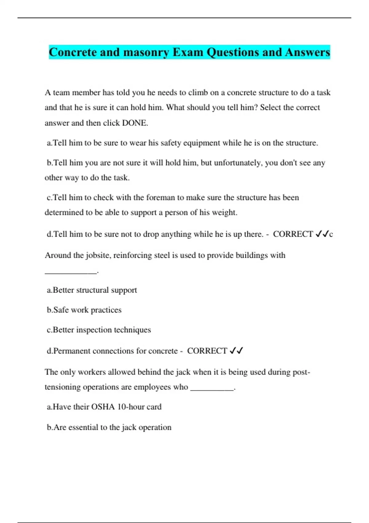 Concrete and masonry Exam Questions and Answers A team member has told you he needs to climb on a concrete structure to do a task and that he is sure it can hold him. What should you tell him? Select the correct answer and then click DONE. a.Tell him to be sure to wear his safety equipment while he is on the structure. b.Tell him you are not sure it will hold him, but unfortunately, you don't see any other way to do the task. c.Tell him to check with the foreman to make sure the structure has been determined to be able to support a person of his weight. d.Tell him to be sure not to drop anything while he is up there. - CORRECT ️️ c Around the jobsite, reinforcing steel is used to provide buildings with ____________. a.Better structural support b.Safe work practices c.Better inspection techniques d.Permanent connections for concrete - CORRECT ️️ The only workers allowed behind the jack when it is being used during post- tensioning operations are employees who __________. a.Have their OSHA 10-hour card b.Are essential to the jack operation c.Are wearing the proper personal protective equipment d.Are supervisors or project managers - CORRECT ️️ b You are in charge of determining the route of a concrete bucket that will soon be loaded and elevated. Which route would be safest? Select the correct answer and then click DONE. a.Through an area where some coworkers are engaged in post-tensioning operations b.Through a cleared out section of the job site that will not be used for another two months c.Through the break area, since lunch is not for another hour d.Through an area where the project engineer is meeting with the foreman - CORRECT ️️ b The minimum personal protective equipment is steel toed-shoes and __________. a.Rain gear b.Fall protection c. Hard hat d.Respirator - CORRECT ️️ c