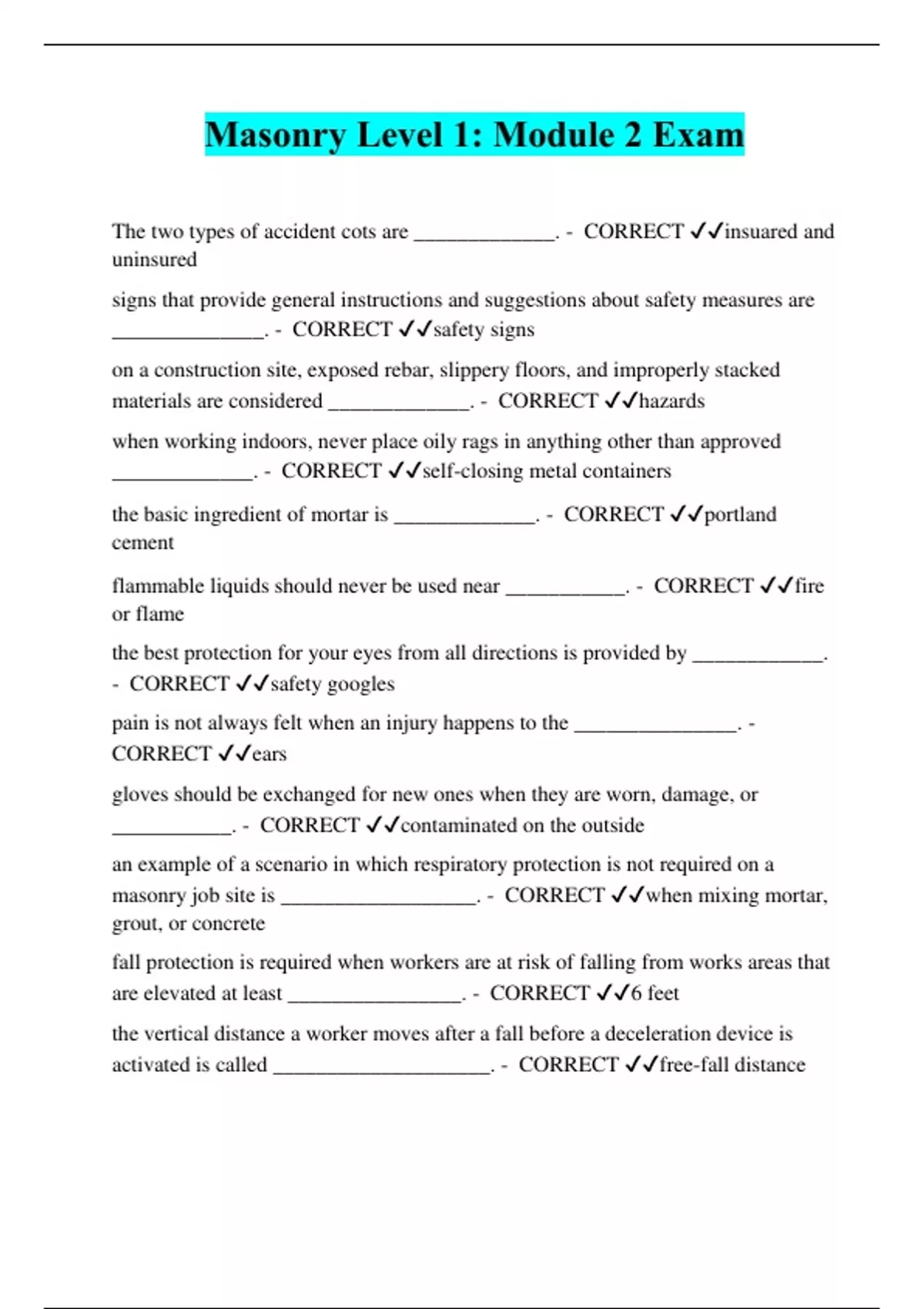 Masonry Level 1: Module 2 Exam The two types of accident cots are _____________. - CORRECT ️️ insuared and uninsured signs that provide general instructions and suggestions about safety measures are ______________. - CORRECT ️️ safety signs on a construction site, exposed rebar, slippery floors, and improperly stacked materials are considered _____________. - CORRECT ️️ hazards when working indoors, never place oily rags in anything other than approved _____________. - CORRECT ️️ self-closing metal containers the basic ingredient of mortar is _____________. - CORRECT ️️ portland cement flammable liquids should never be used near ___________. - CORRECT ️️ fire or flame the best protection for your eyes from all directions is provided by ____________. - CORRECT ️️ safety googles pain is not always felt when an injury happens to the _______________. - CORRECT ️️ ears gloves should be exchanged for new ones when they are worn, damage, or ___________. - CORRECT ️️ contaminated on the outside an example of a scenario in which respiratory protection is not required on a masonry job site is __________________. - CORRECT ️️ when mixing mortar, grout, or concrete fall protection is required when workers are at risk of falling from works areas that are elevated at least ________________. - CORRECT ️️ 6 feet the vertical distance a worker moves after a fall before a deceleration device is activated is called ____________________. - CORRECT ️️ free-fall dista